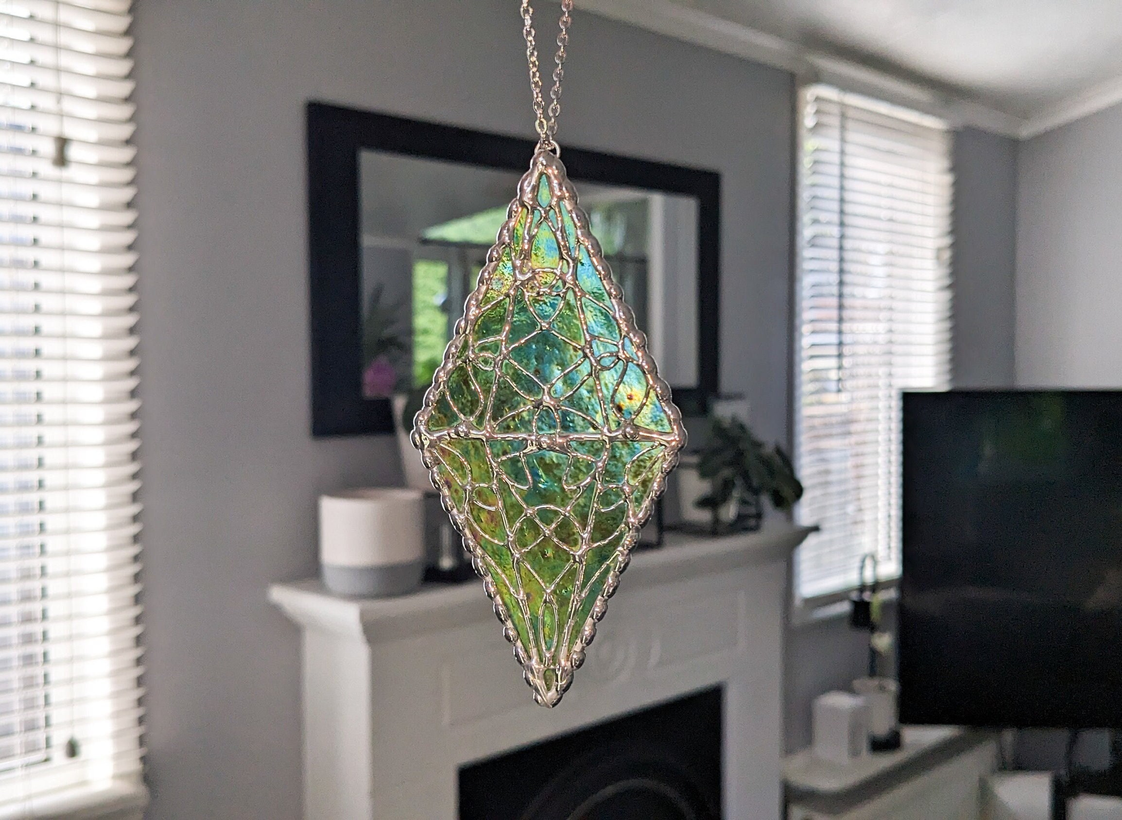 Green iridised glass & sparkly solder crystal hanging suncatcher. Check out the video for a grea...