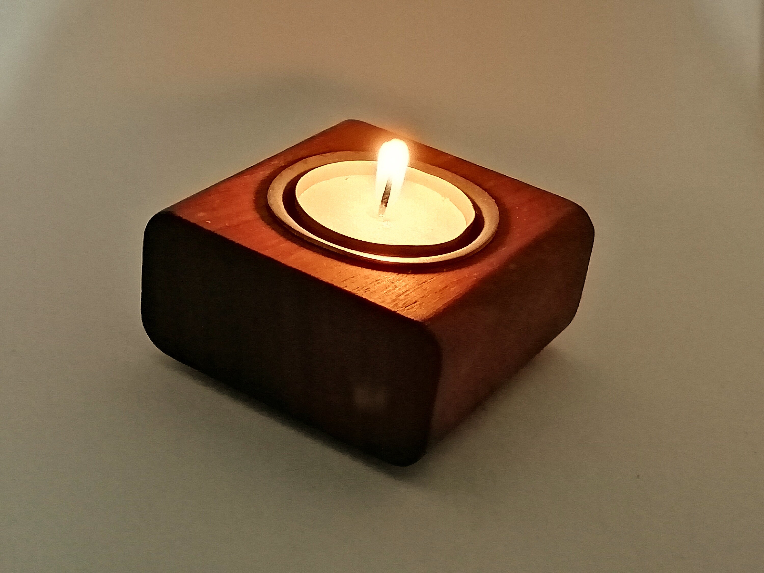 Solid, chunky wooden tealight holder with metal inserts and protective base. Looks great in traditio...