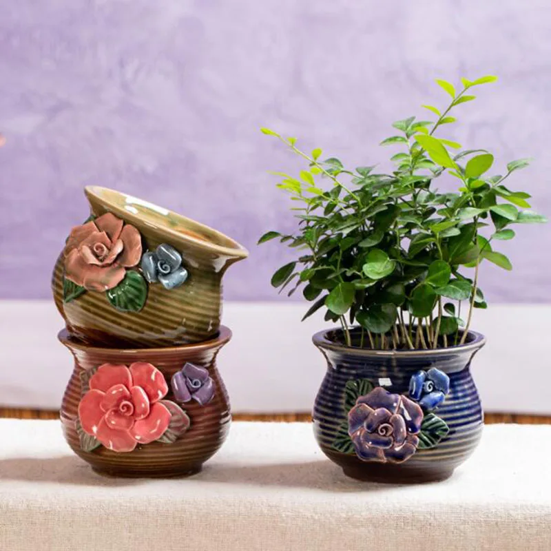 Ceramic Succulent Plant Pot Large Caliber Flowerpot Exquisite Relief Flower Pattern Vase Desktop Orn...