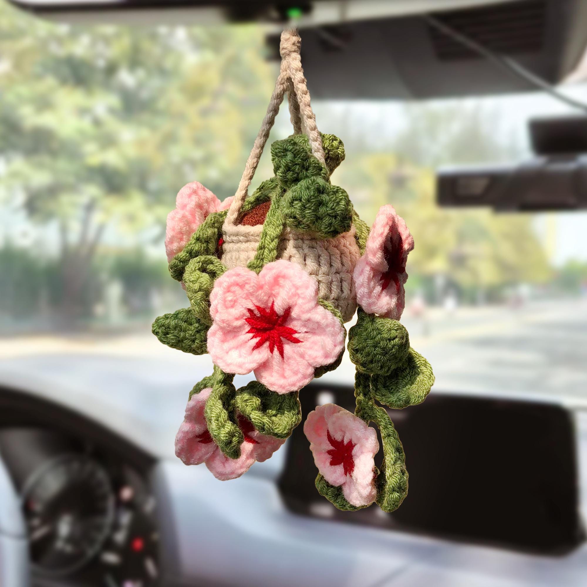 Crochet Cherry Blossom Car Mirror Charm - Handmade Hanging Flower Basket Add a touch of springtime c...