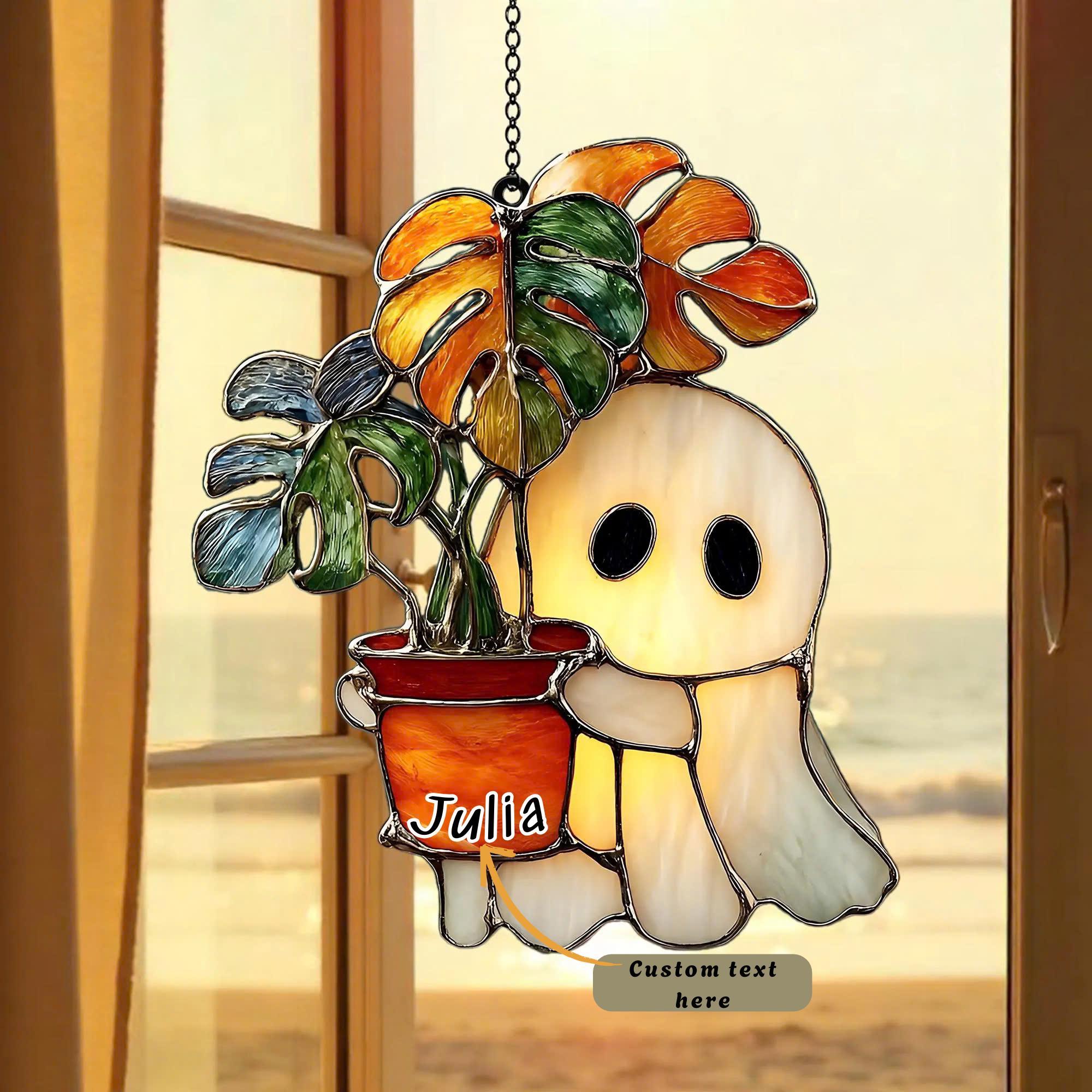 Plant Loving Ghost Acrylic Window Hanging, Monstera Ghost Faux Stai...