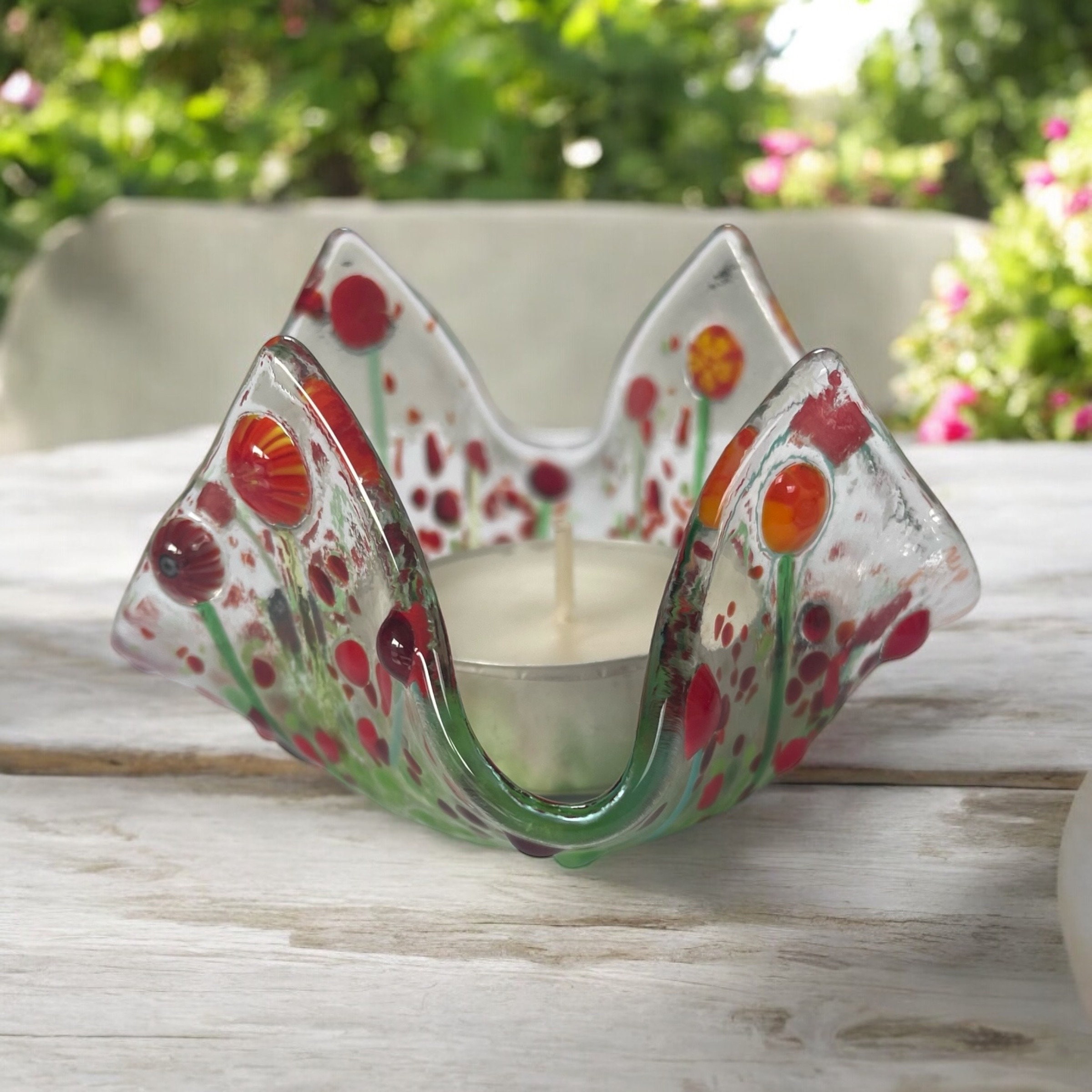 Handmade fused glass tea light candle holder. Red garden flowers with ladybirds design created using...