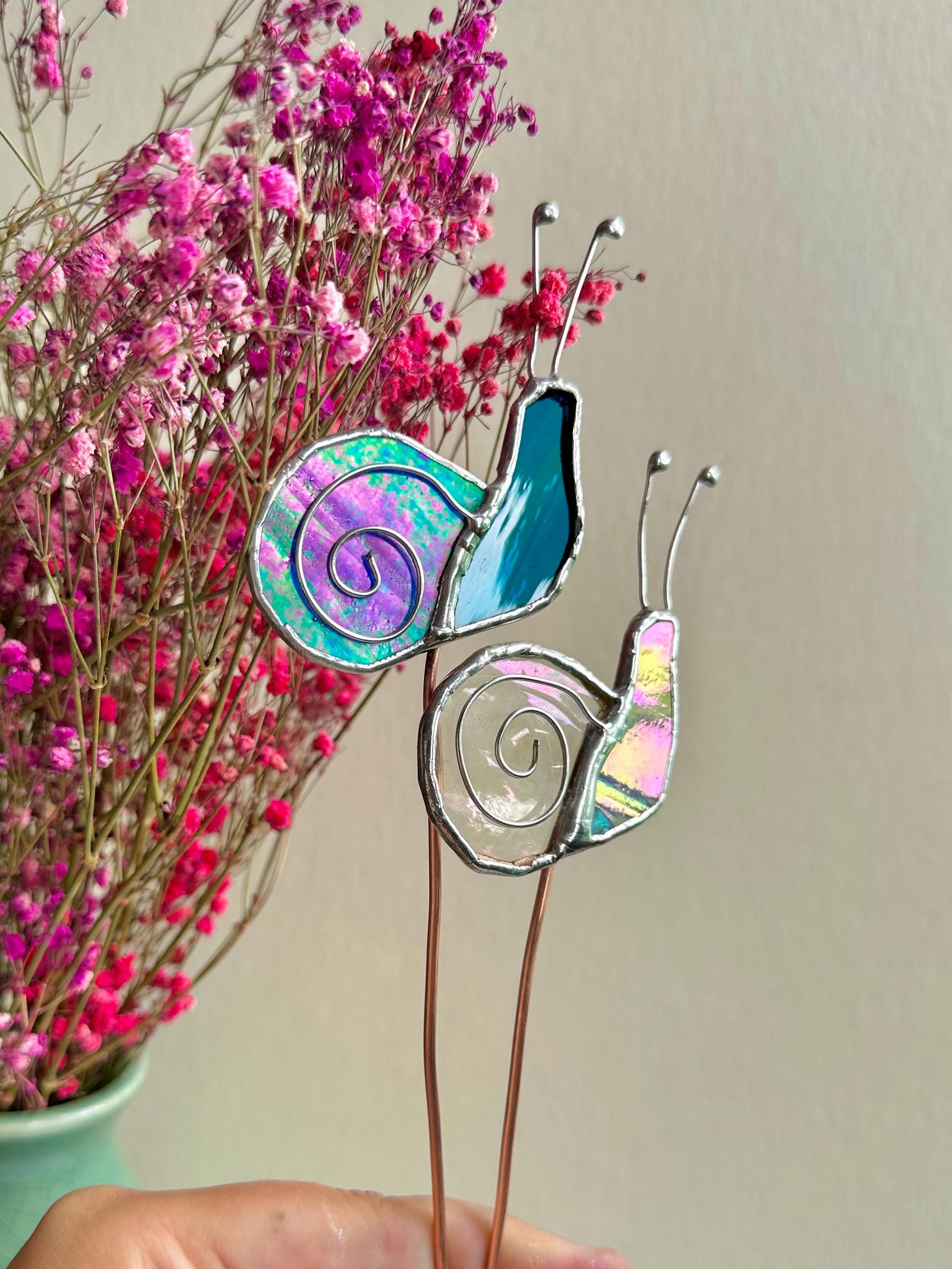 Stained Glass Set Of Two Iridescent Snail Plant Stakes | Snail Sunc...