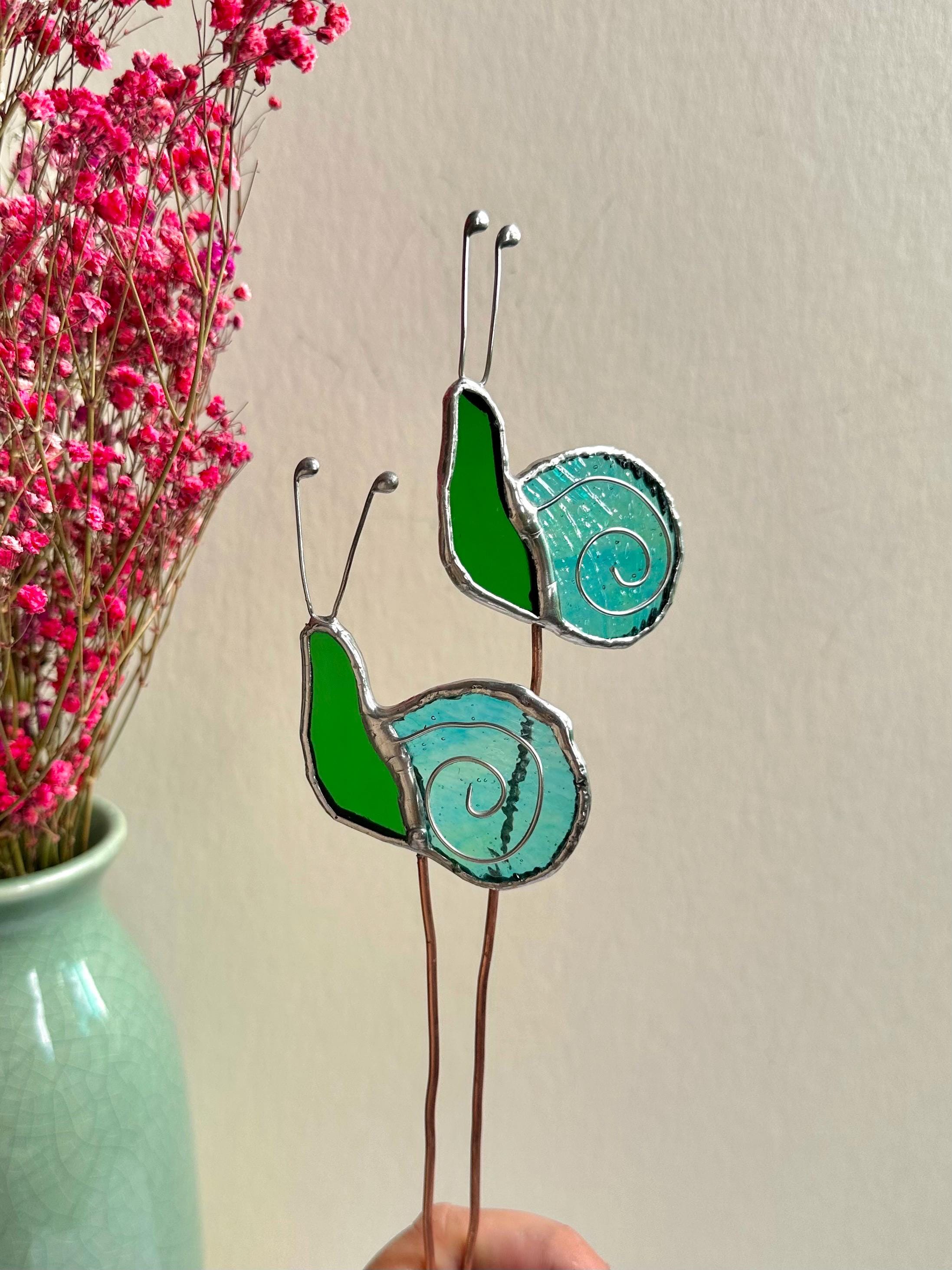 Stained Glass Set Of Two Green Blue Snail Plant Stakes | Snail Sunc...