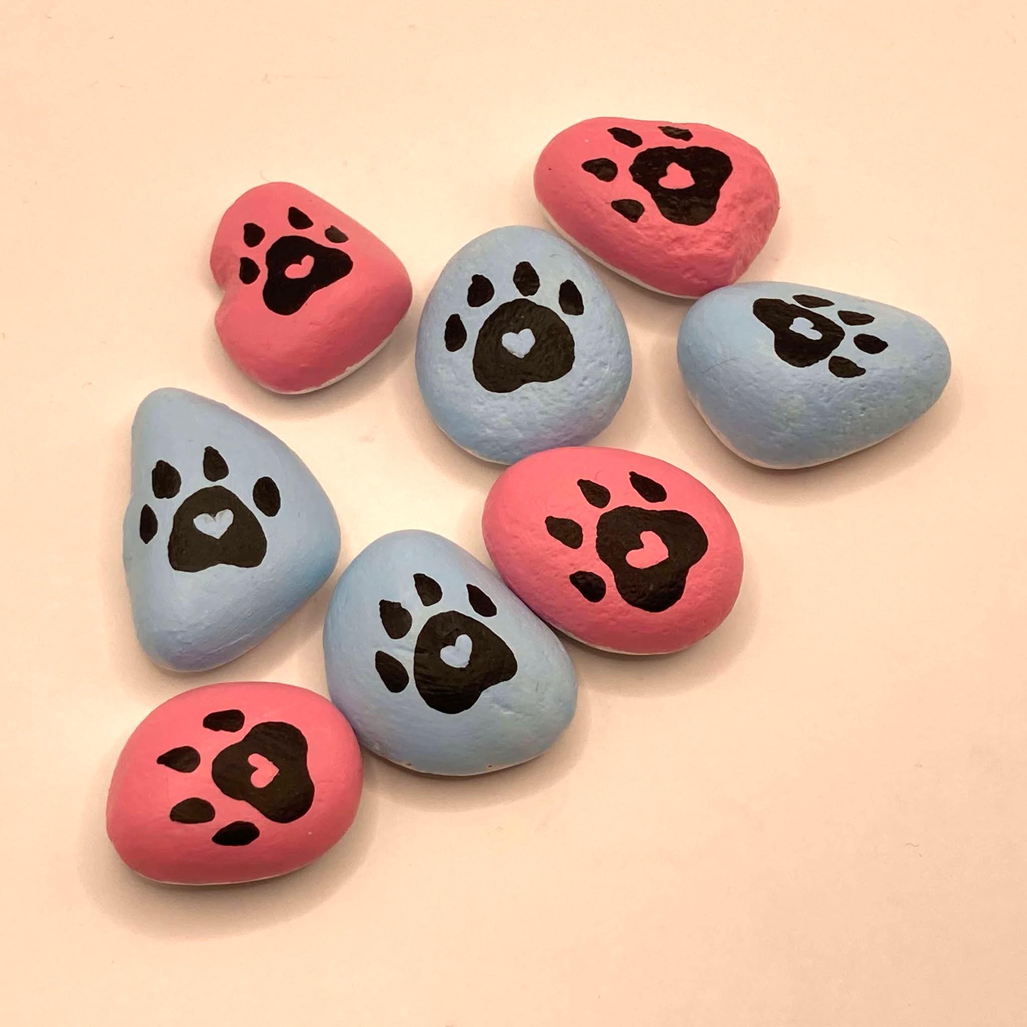 This listing is for a set of 4 paw print rocks with a heart inside. Pick from pink or blue and get i...