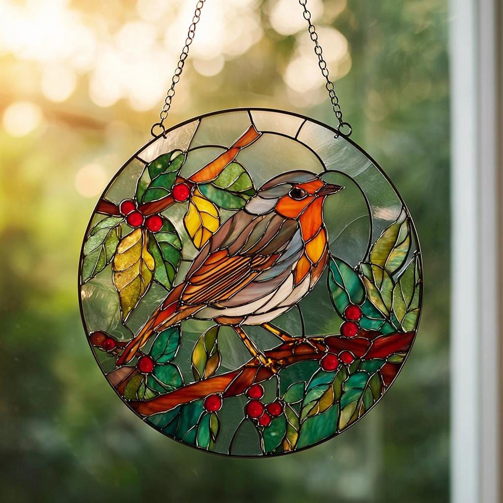 Robin Bird Stained Glass Suncatcher, Michigan Bird Flower Natural A...