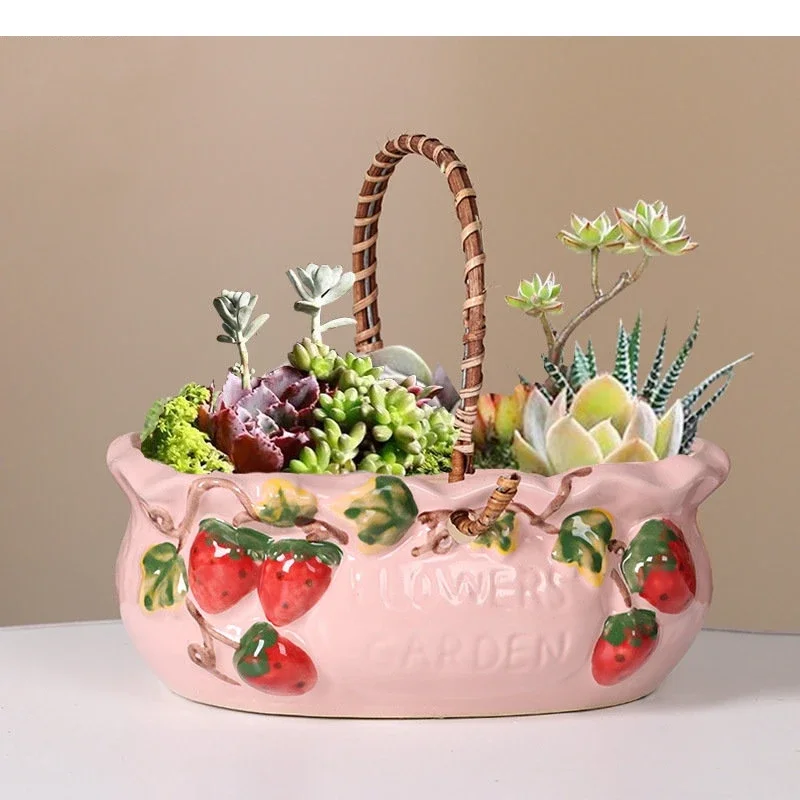 Strawberry Relief Tote Basket Flower Pots Ceramic Vase Desk Decoration Potted Plants Floral Vases Po...
