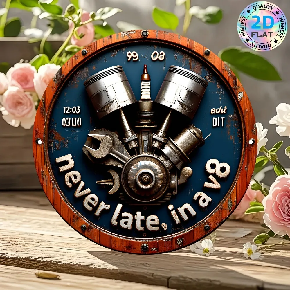 2D Flat Retro V8 Engine Metal Wall Plaque - Rustic Blue & Orange Garage Decor | Features Wrench ...