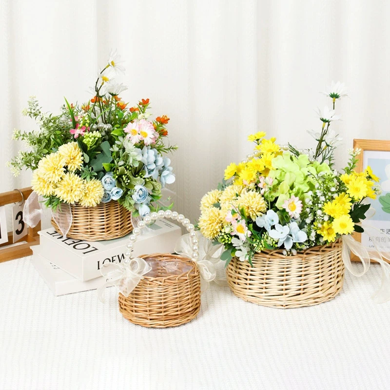 One wicker rattan flower child Basket with Pearl handle and bow Han...