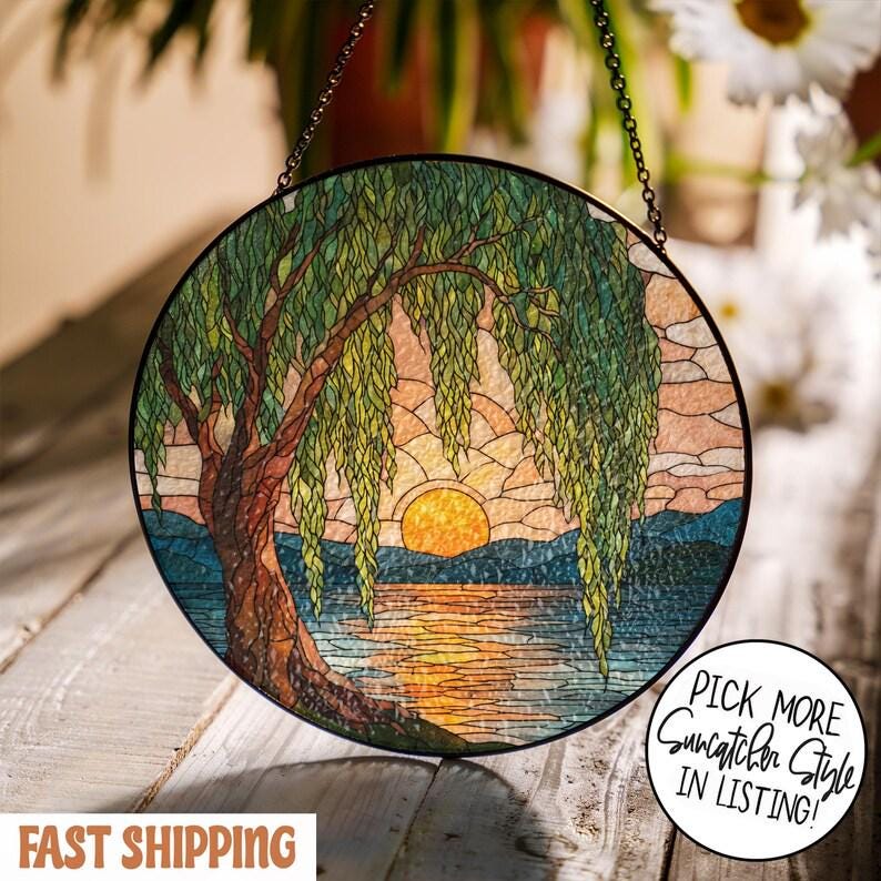 Weeping Willow Faux Stained Glass Suncatcher, Window hangings for garden, House Decoration, Housewar...
