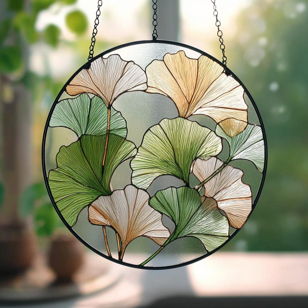 Round Ginkgo Leaf Stained Glass Suncatcher, Ginkgo Window Hanging, ...