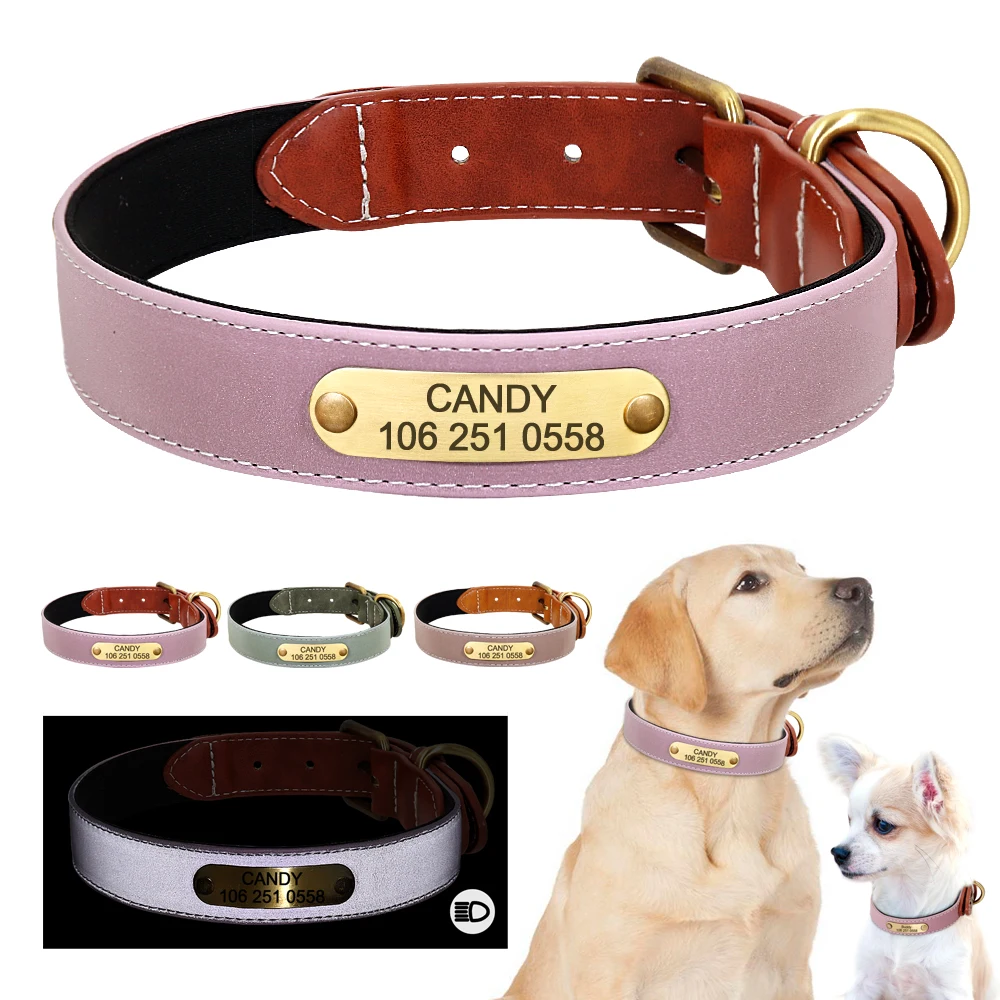 Engraved Dog Cat Collar Reflective Leather Puppy Collar Custom Dog ...