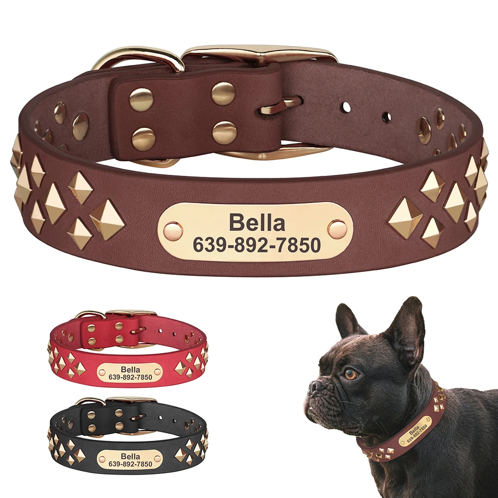 Genuine Leather Dog Collar Personalized Dog ID Collars Necklace Spiked Studded Real Leather Pet Coll...