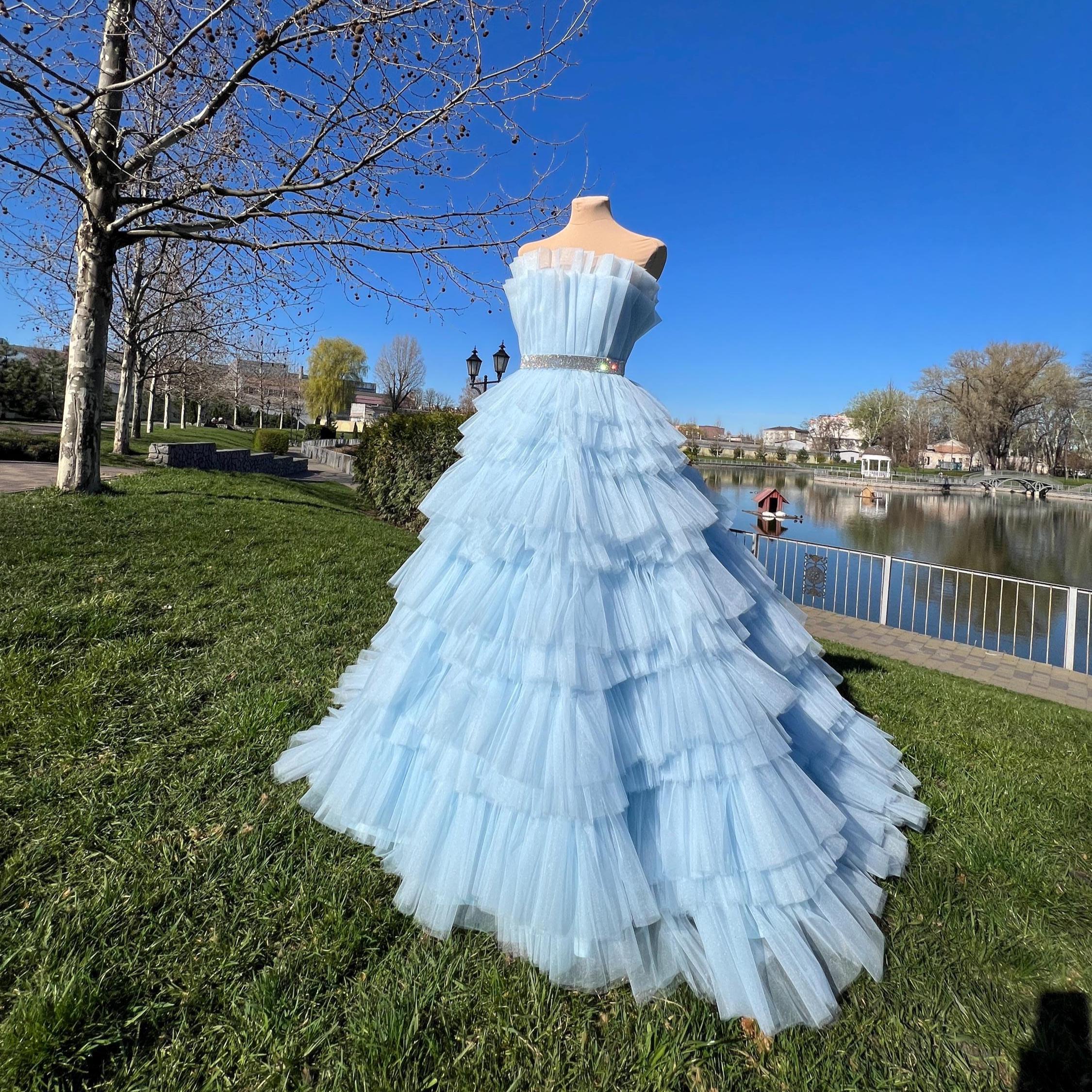 Gorgeous sick fluffy blue dress,Light blue ball gown,Multilayer corset dress,Airy wedding dress,Doll...