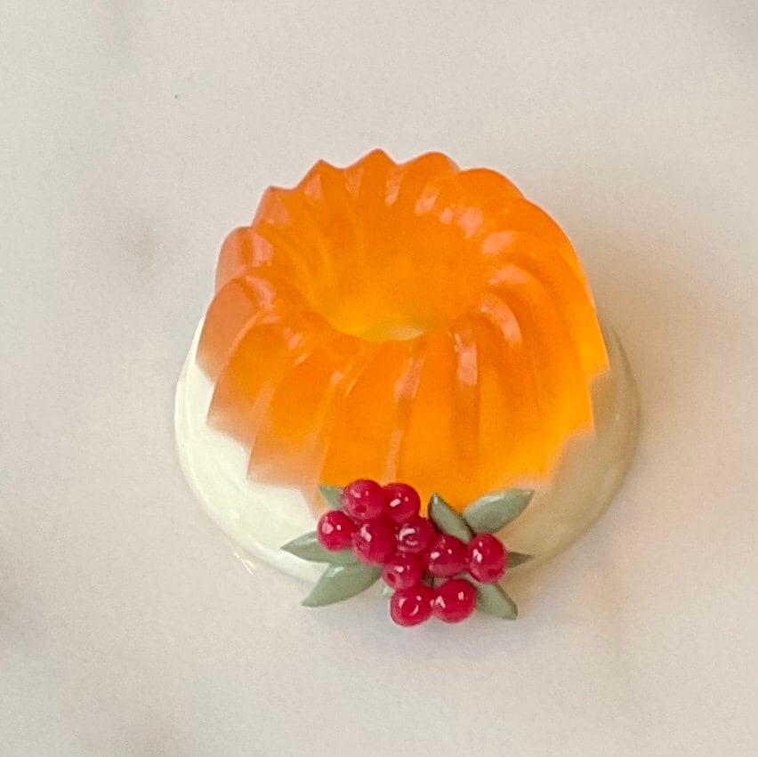 1 Miniature orange jello cake with cherries for dolls or dollhouses. Approximately 1 1/4 inch in dia...