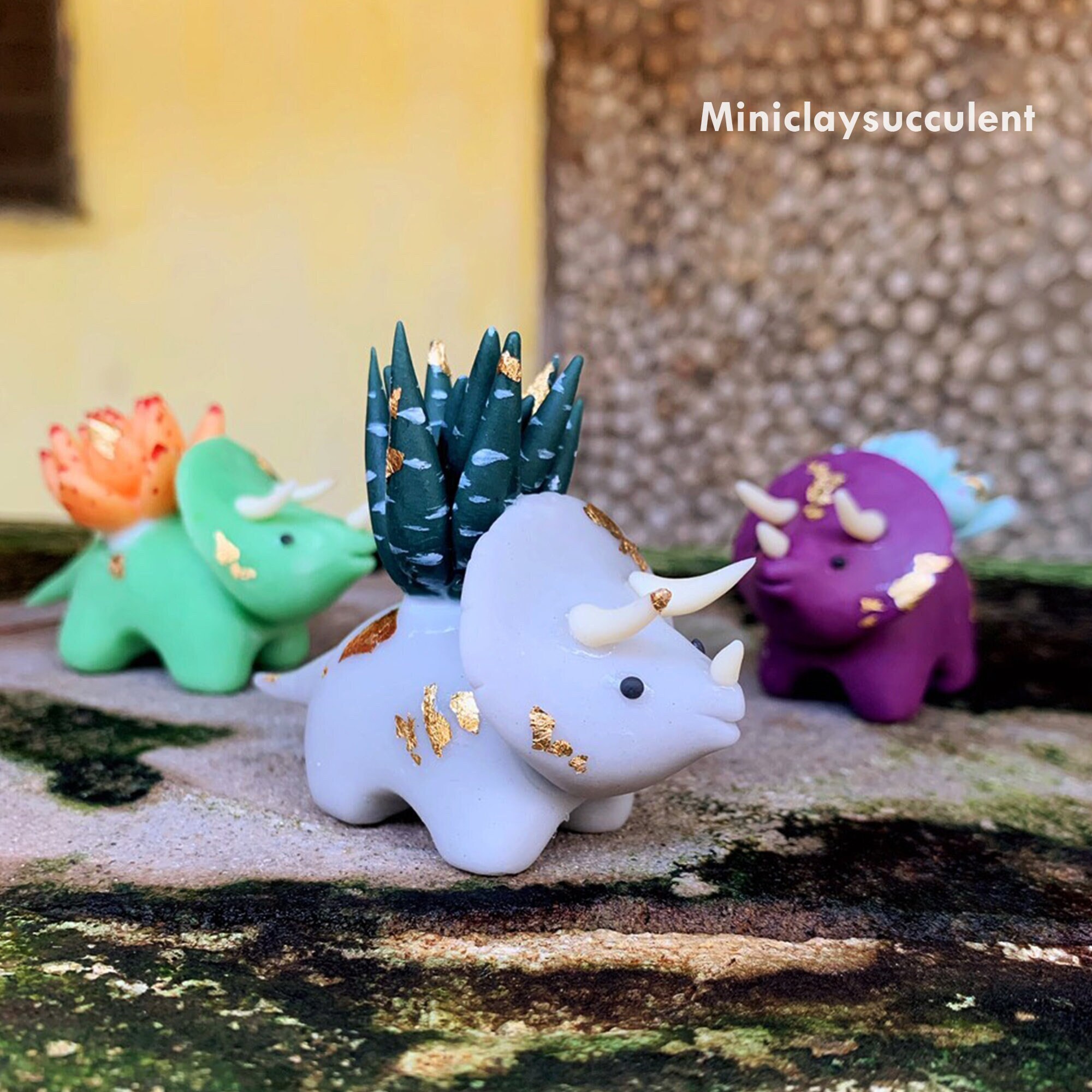 "Set Triceratops dinosaur & succulent planter is carefully air clay and hand painted with v...