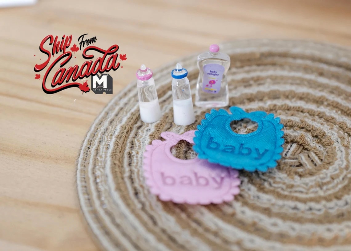 This is a 1 inch scale or 1:12 miniature baby feeding set with 2 feeding bottles, 2 baby bibs and a ...