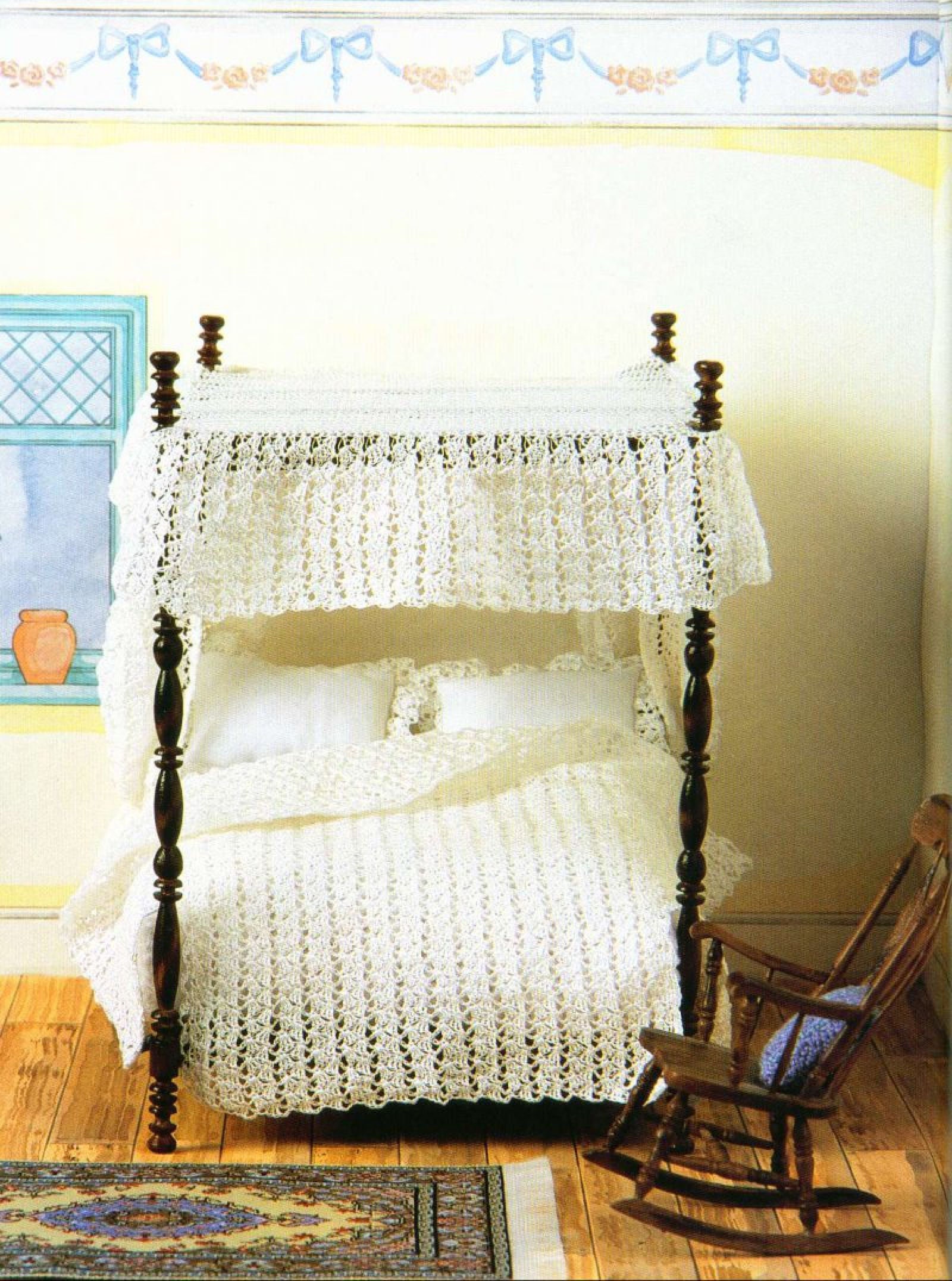 This is a digitally restored vintage crochet pattern to make a miniature canopy, bed curtains, bedsp...