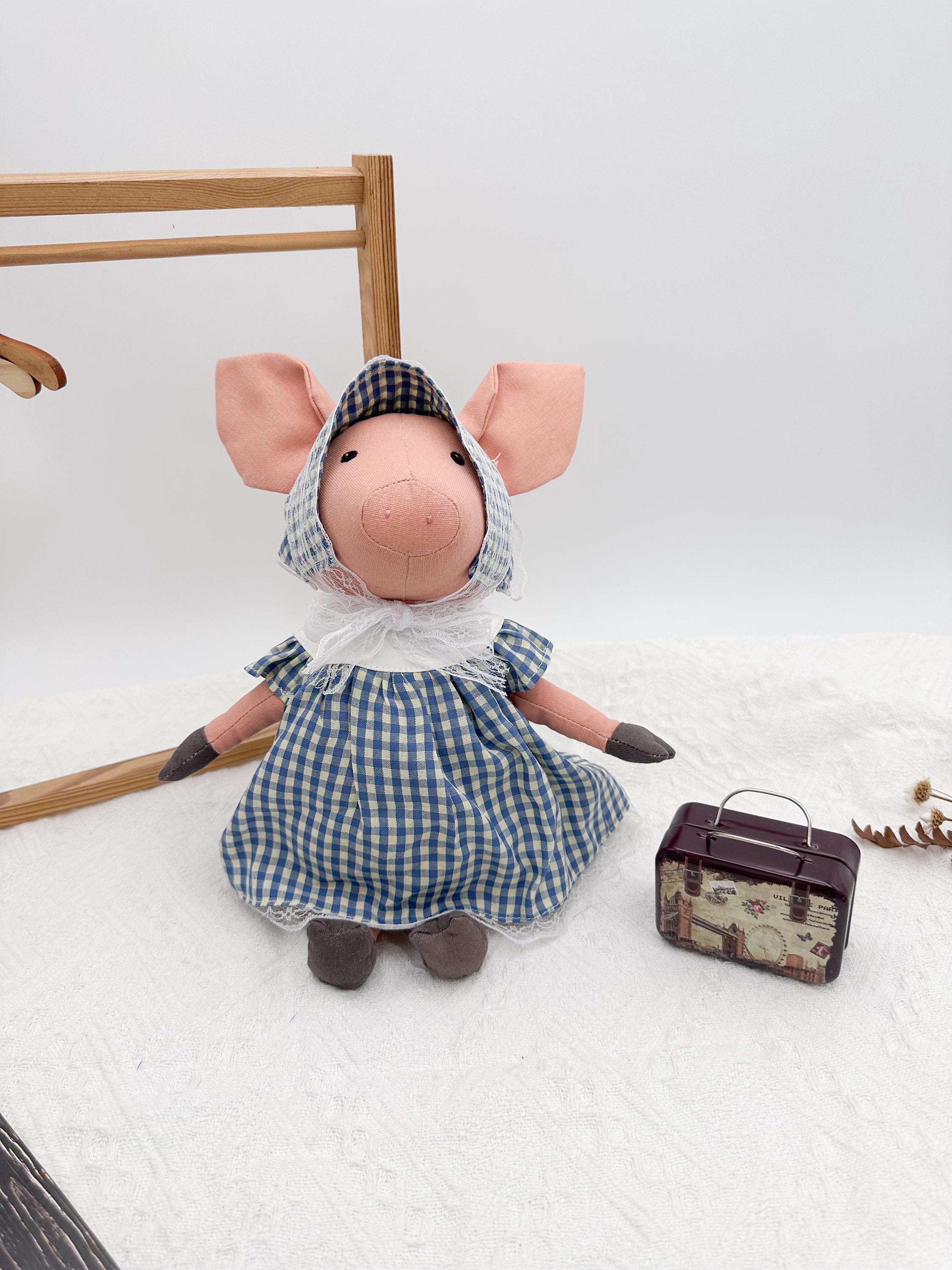 Handmade fabric linen pig doll with dress and headscarf, Cute pig p...
