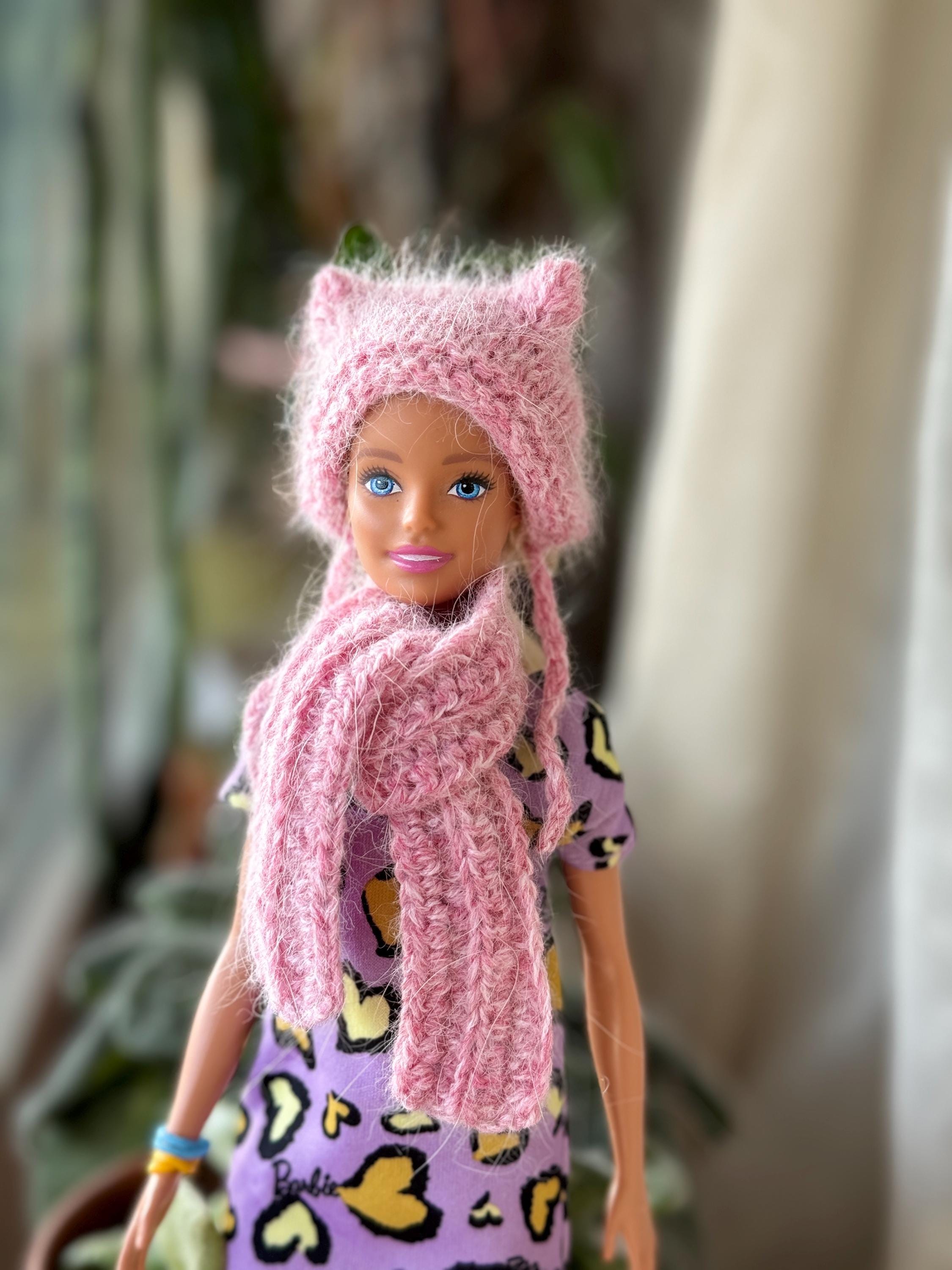 This is a hand made miniature knitted bonnet hat with cat ears for doll 1/6 scale and crochet scarf ...
