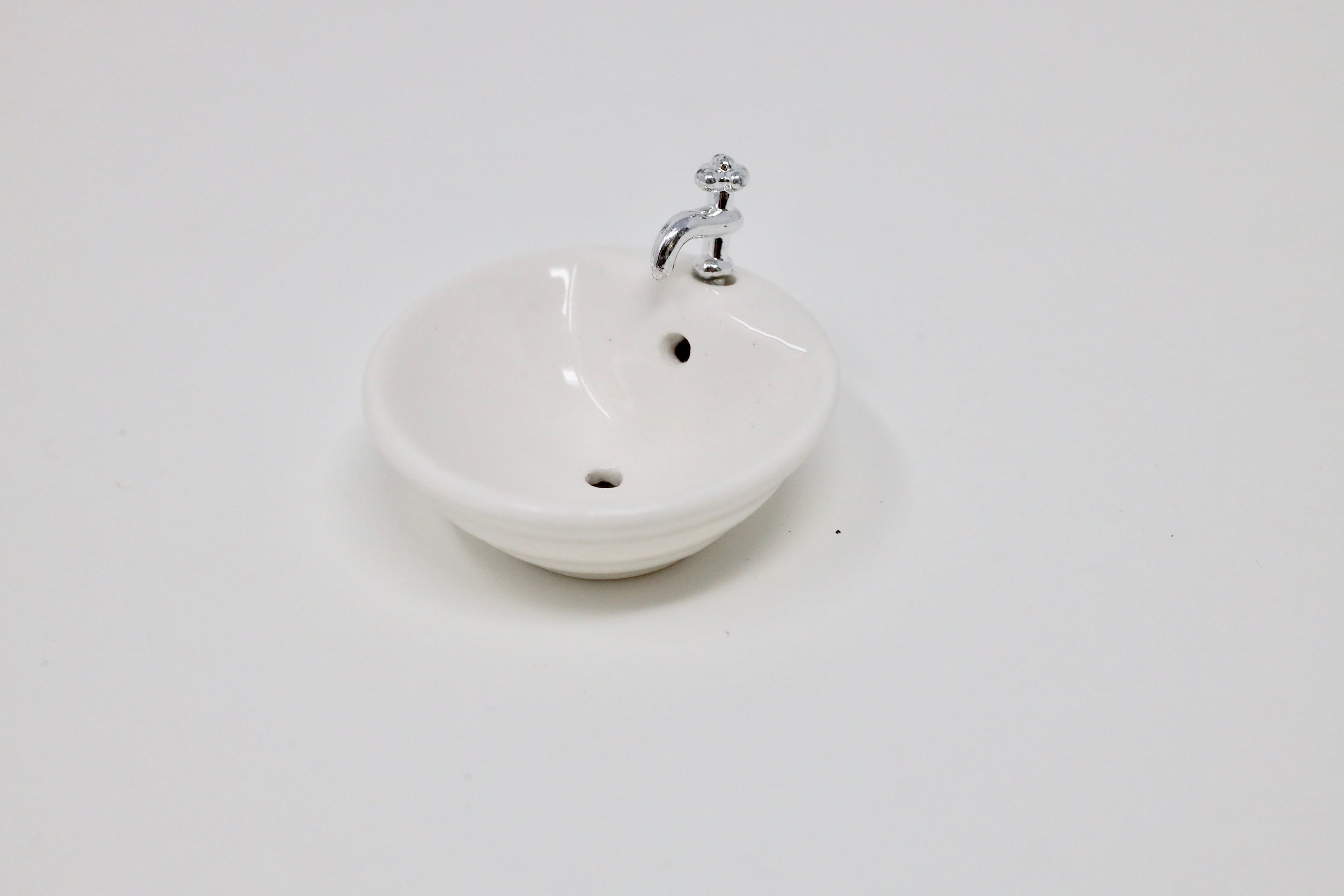 "1:12 Dollhouse Miniature Round Sink Attached silver faucet Hole on side and bottom (hole on bo...