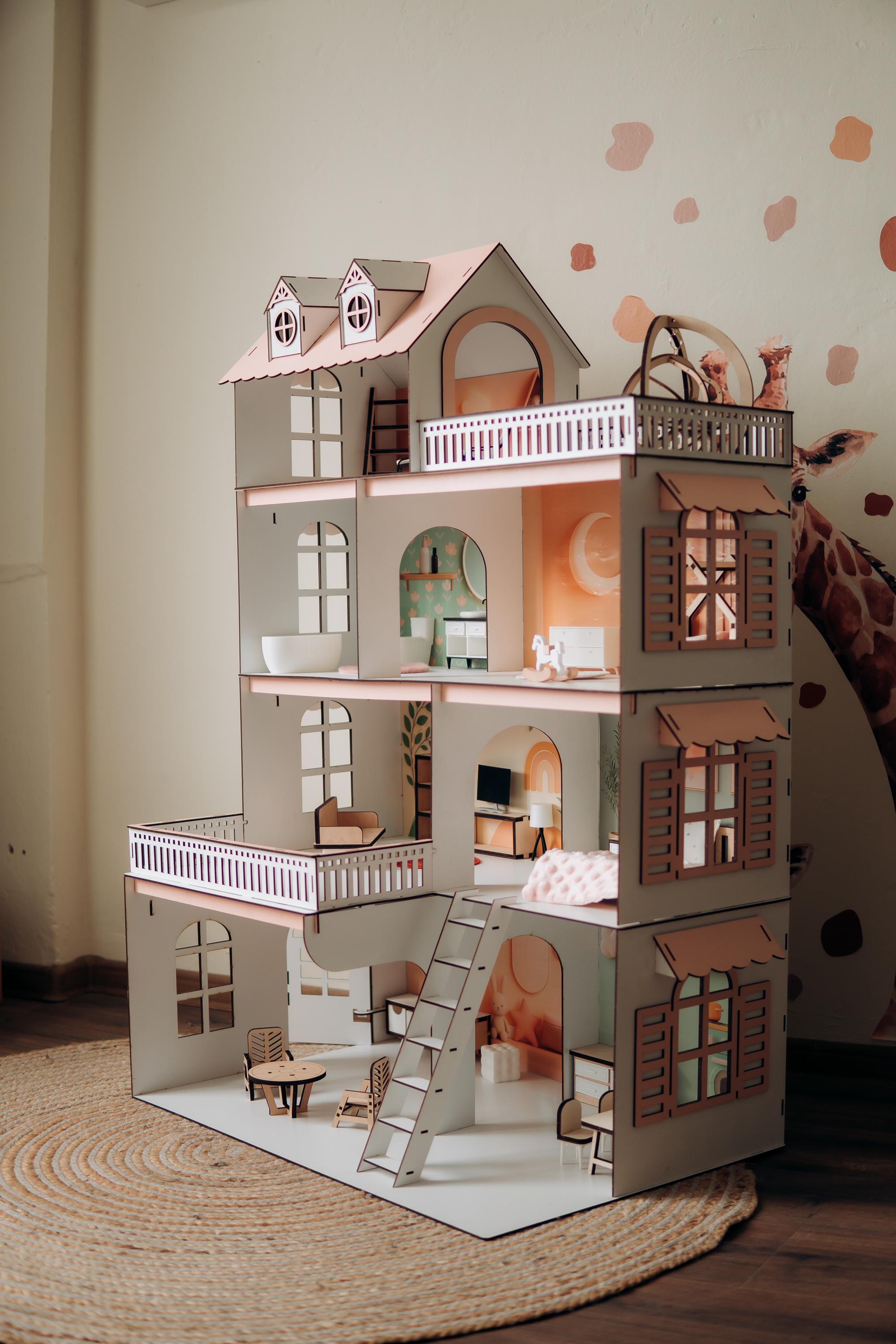 Pink dollhouse for girl, house with windows, wooden dollhouse, play...