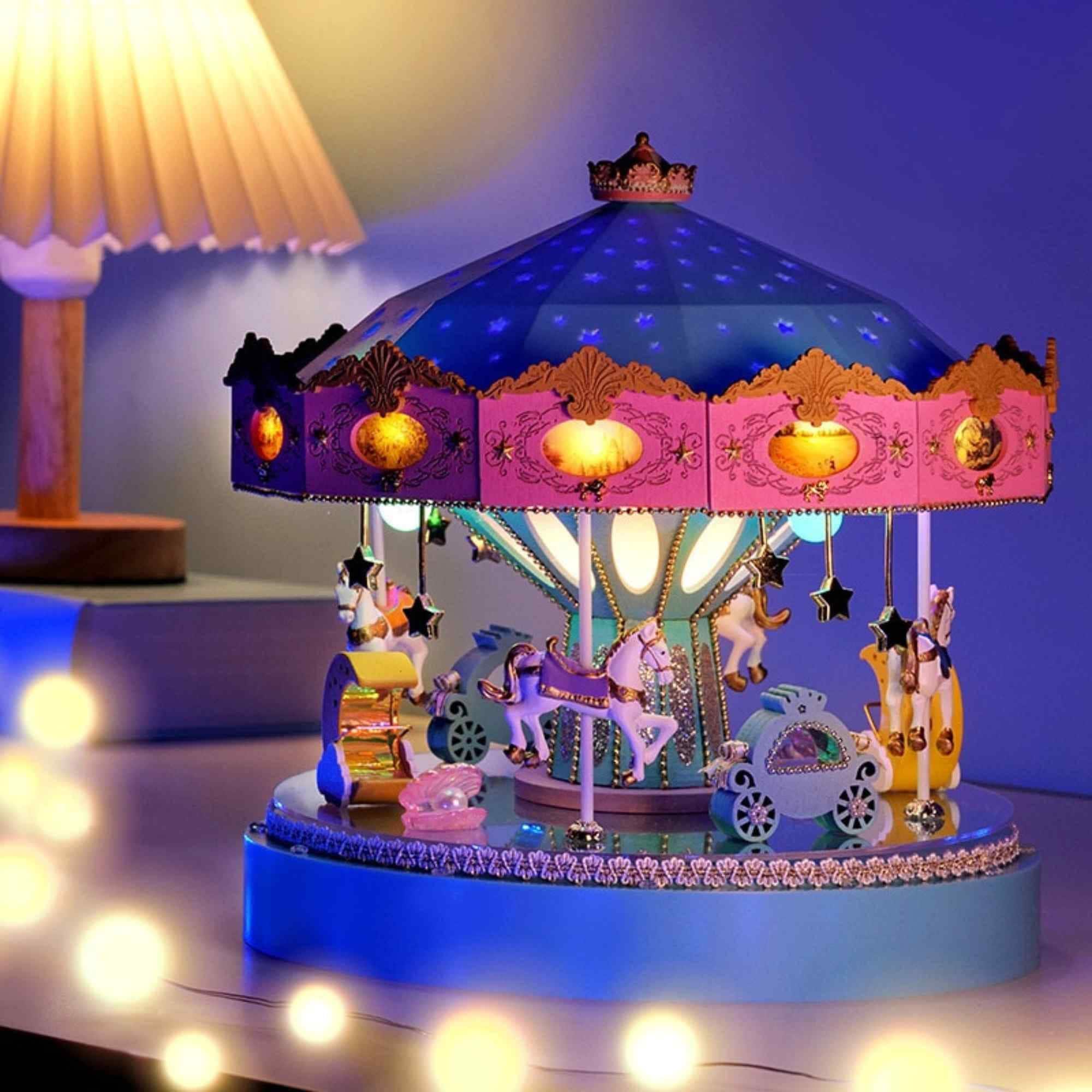 Wooden Carousel Music Box With Colorful Lights, Miniature Dollhouse...