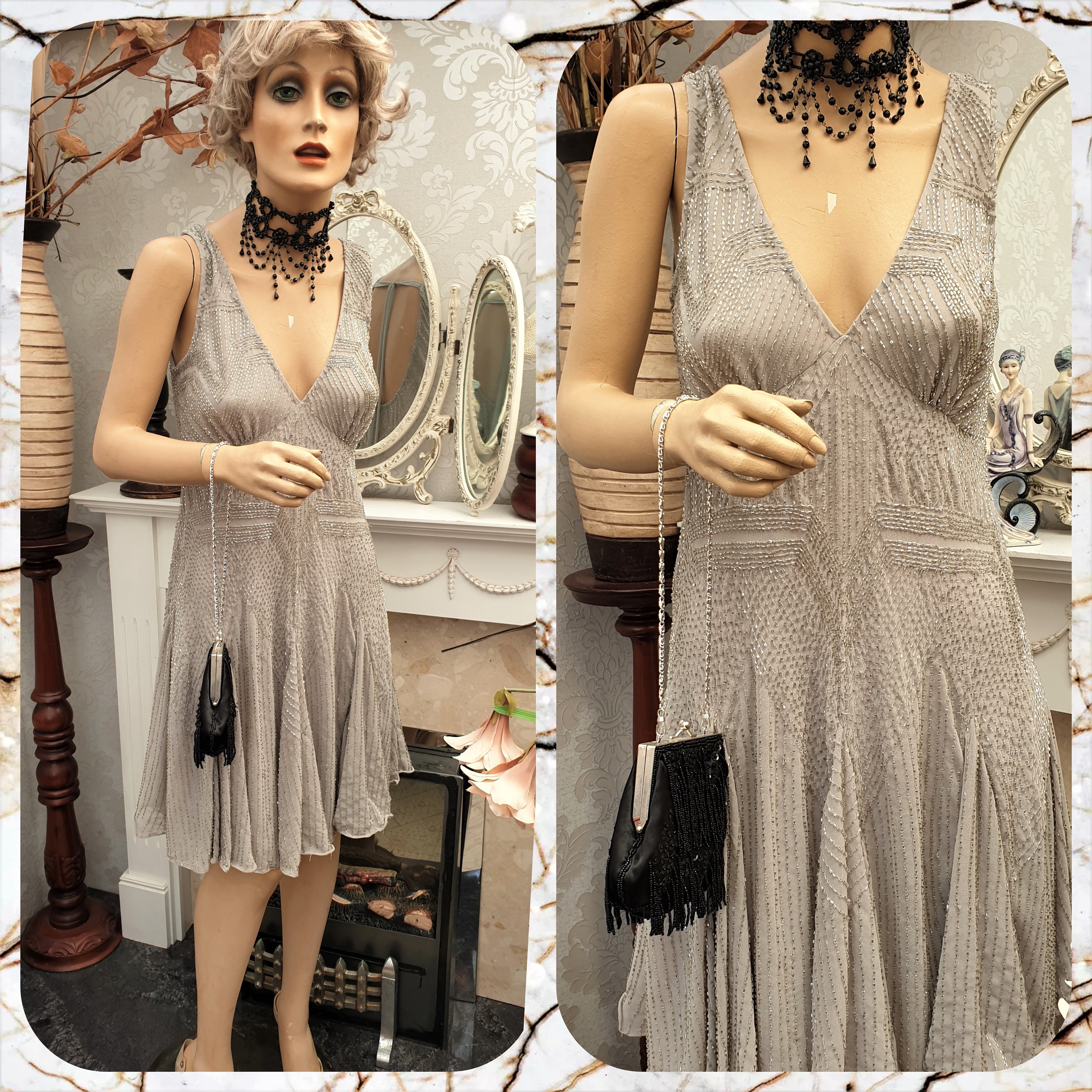 "Beautiful 1920's style dress embellished with silver glass beads on a grey semi sheer silk. Bi...