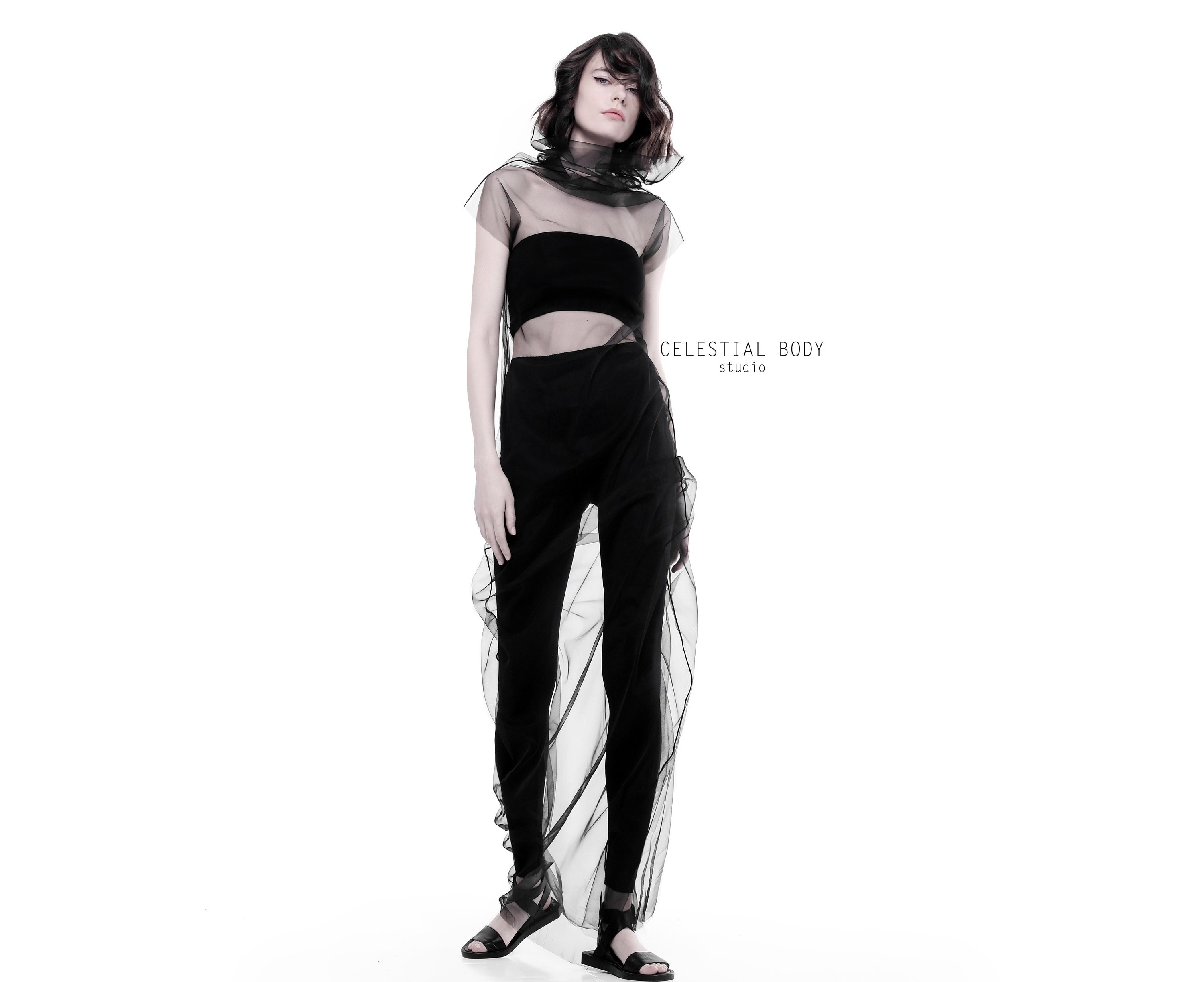 Avant garde Sheer tulle overlay dress. Extravagant Black mesh turtl...