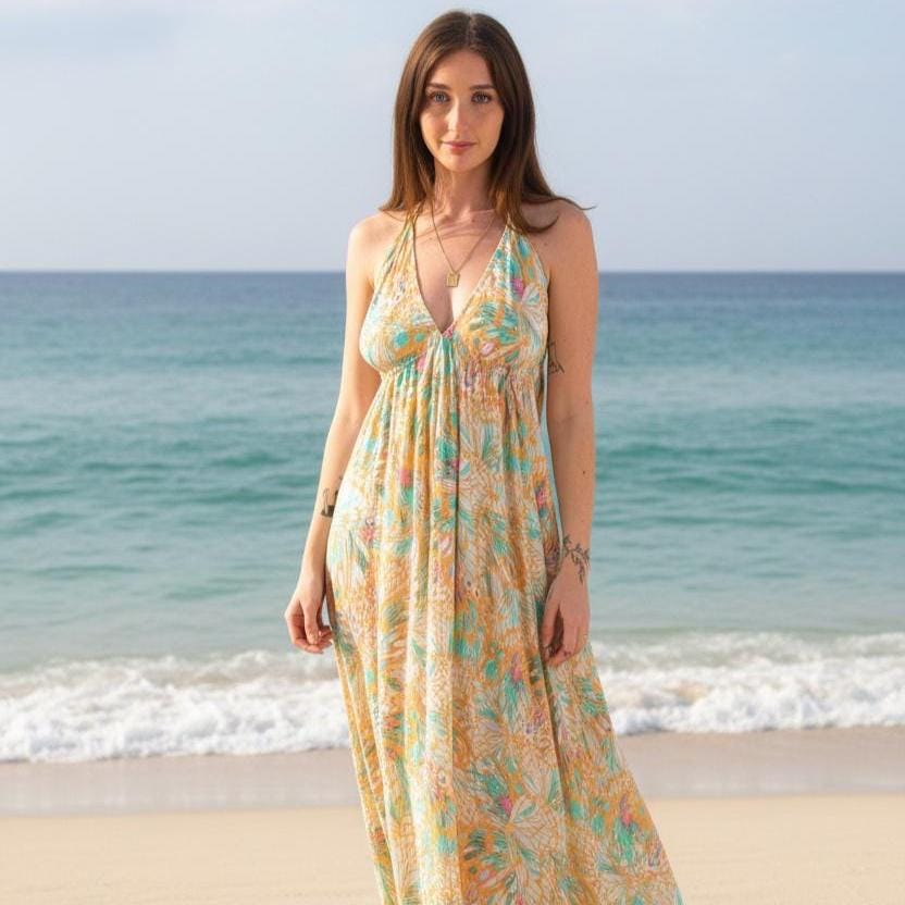 "This green silk halter maxi dress is a stunning backless boho dress designed for effortless fe...