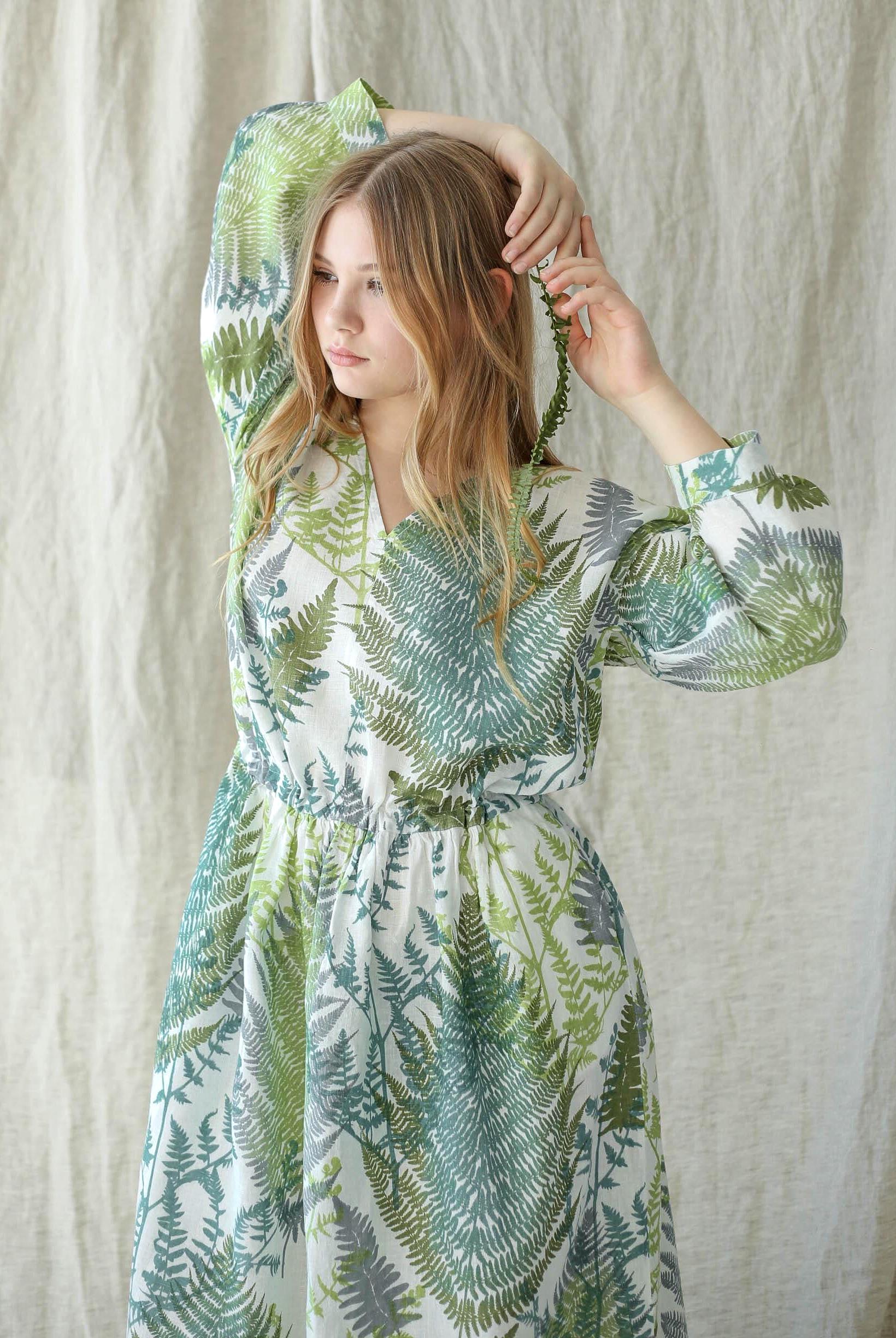 MAEVE Green Myth Hand Printed Linen Maxi Dress, Botanical Fern Prin...