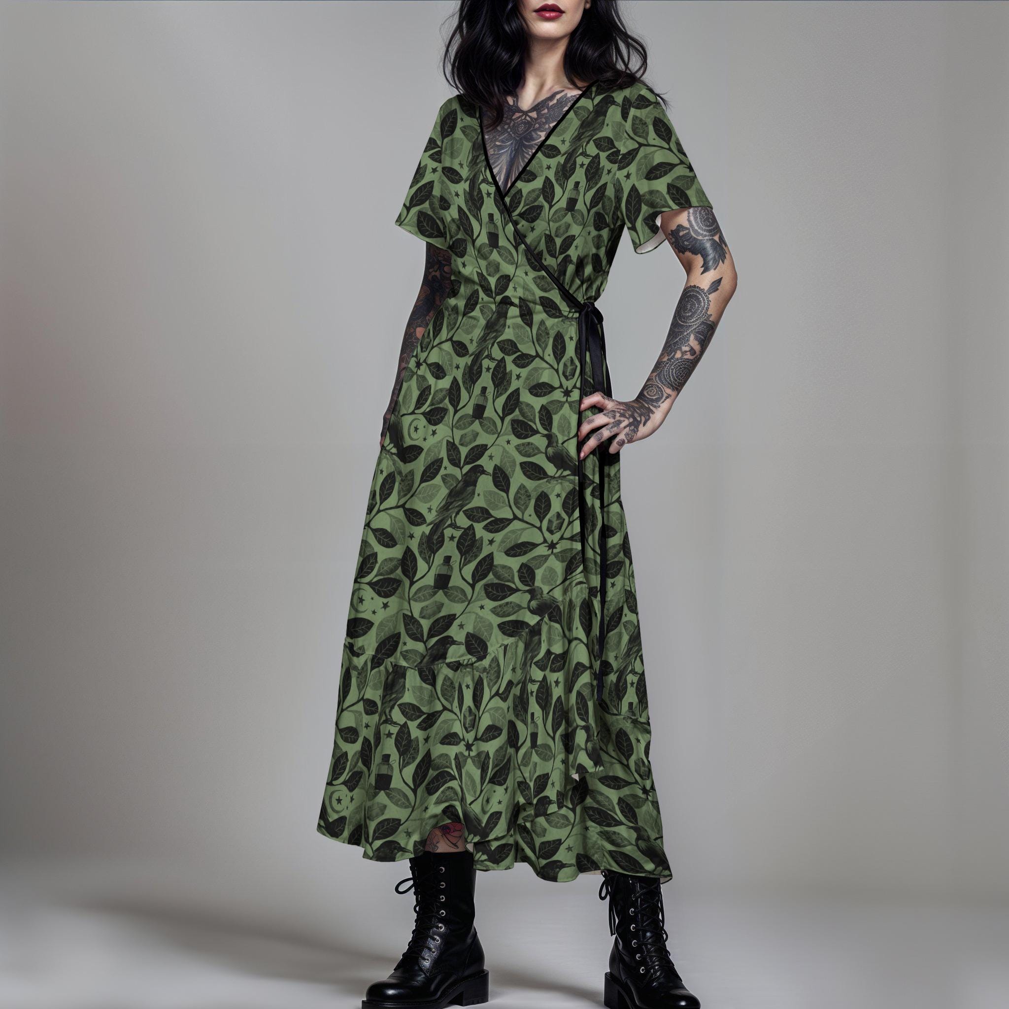 Green Raven Wrap Dress, Witchy Botanical Casual Maxi-Dress w/ Occul...