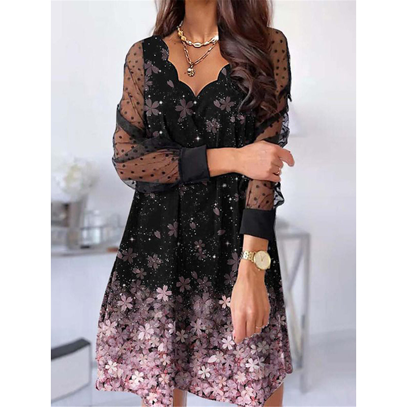 Women's Casual Dress Floral Mesh Patchwork Scalloped Neck Mini Dres...