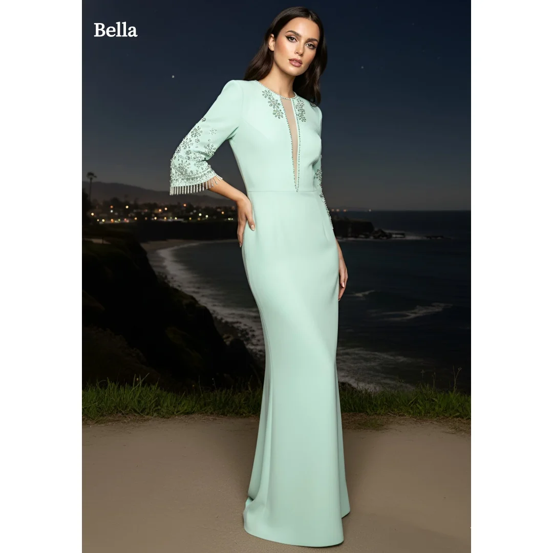 Bella Customized Mint Green Crew Neck 3/4 Sleeve Embroidered Fringe Trim Sheer Placket Beaded robes ...