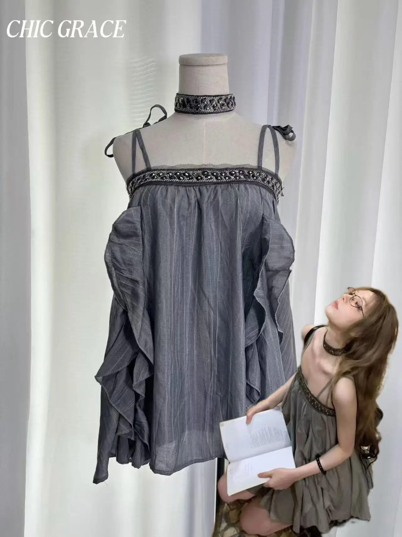 Choker Matching Set! French Vintage Gray Dress Women Spaghetti Strap Rhinestone Ruffle Hem A Line Mi...