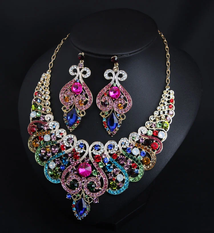 Colorful gemstone short choker necklace and earrings set - formal evening gown bridal women's access...