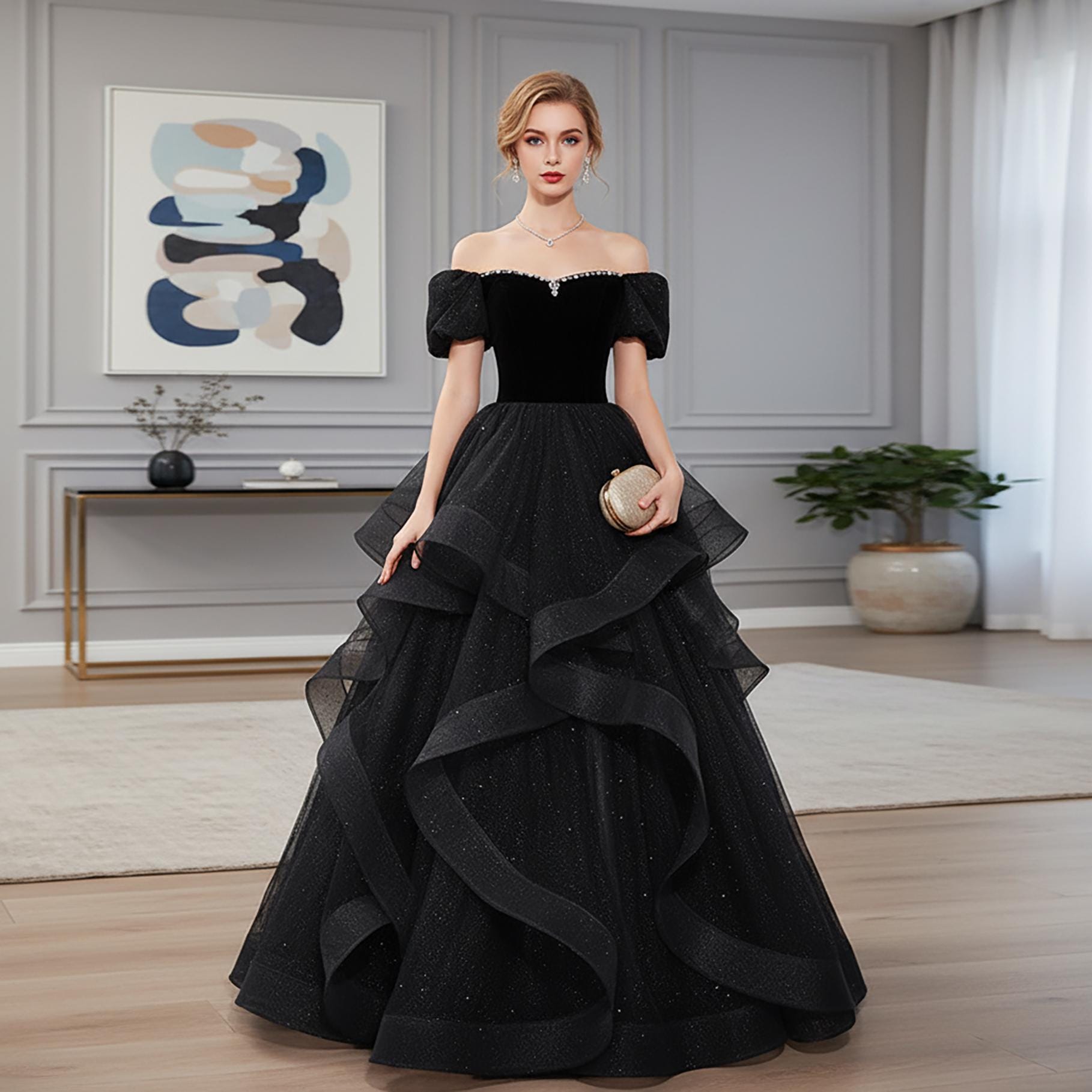 Elegant Black Off Shoulder Prom Dress, Tulle Prom Dress, Elegant Dr...
