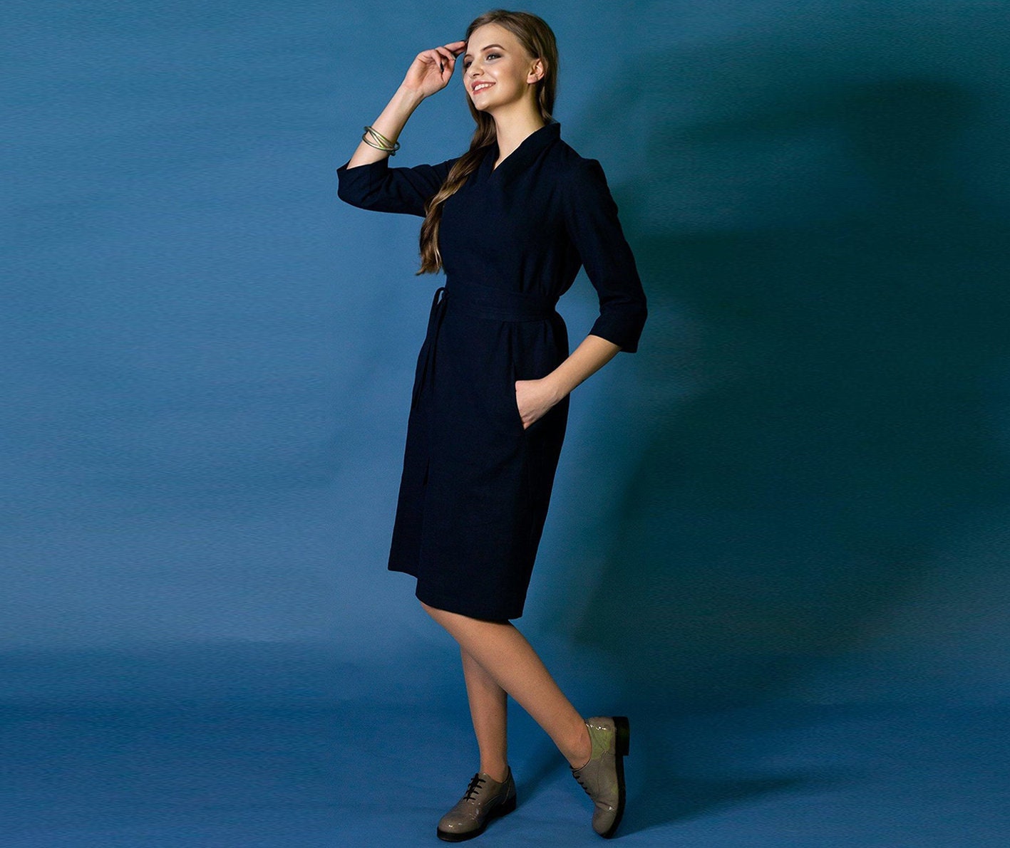 Dark blue linen dress with stand up collar Features > Dress length: 105 cm (41,33'') > Stand u...