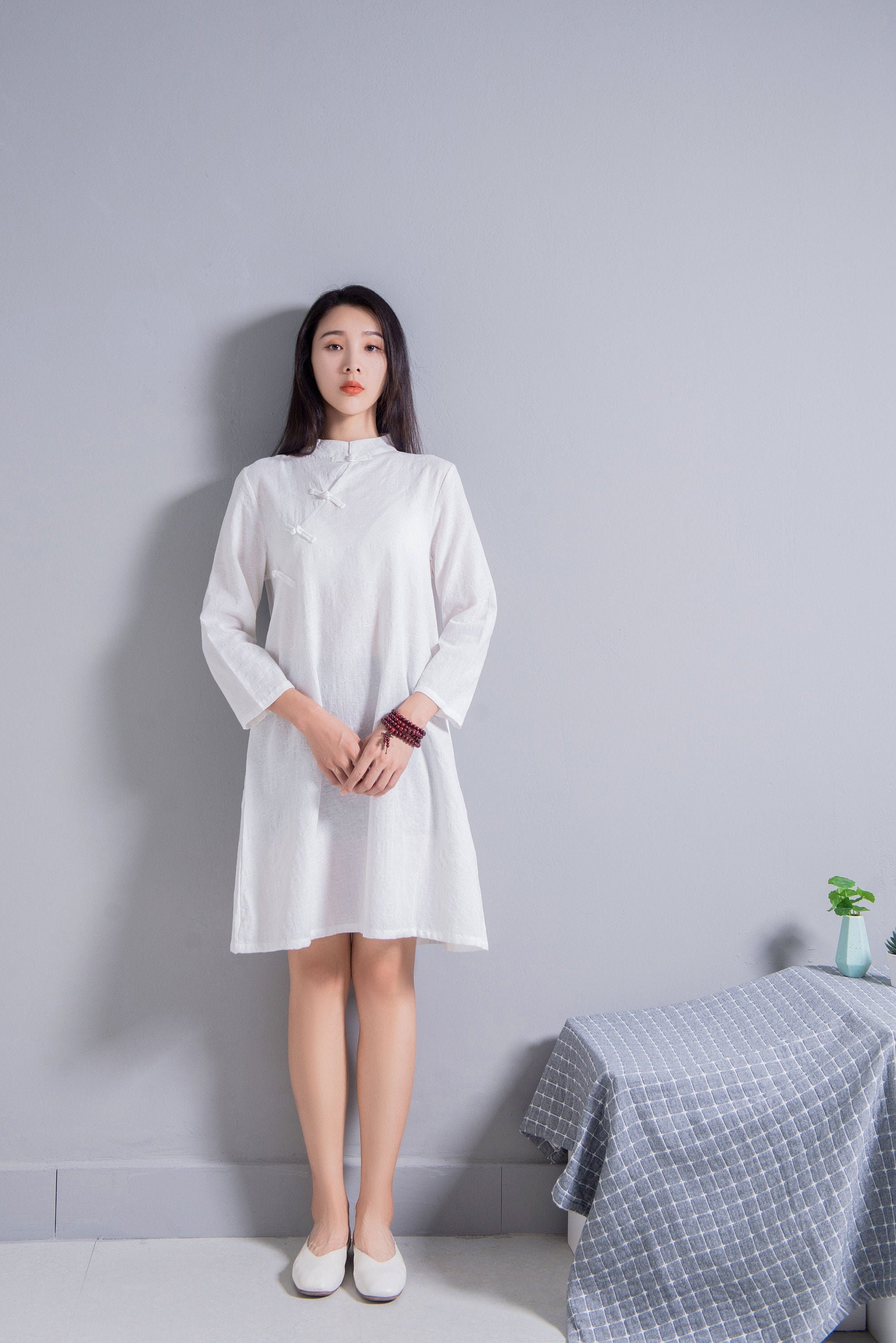 Cheongsam Style Jacquard Linen Dress Soft Cotton Linen Dress Plus S...