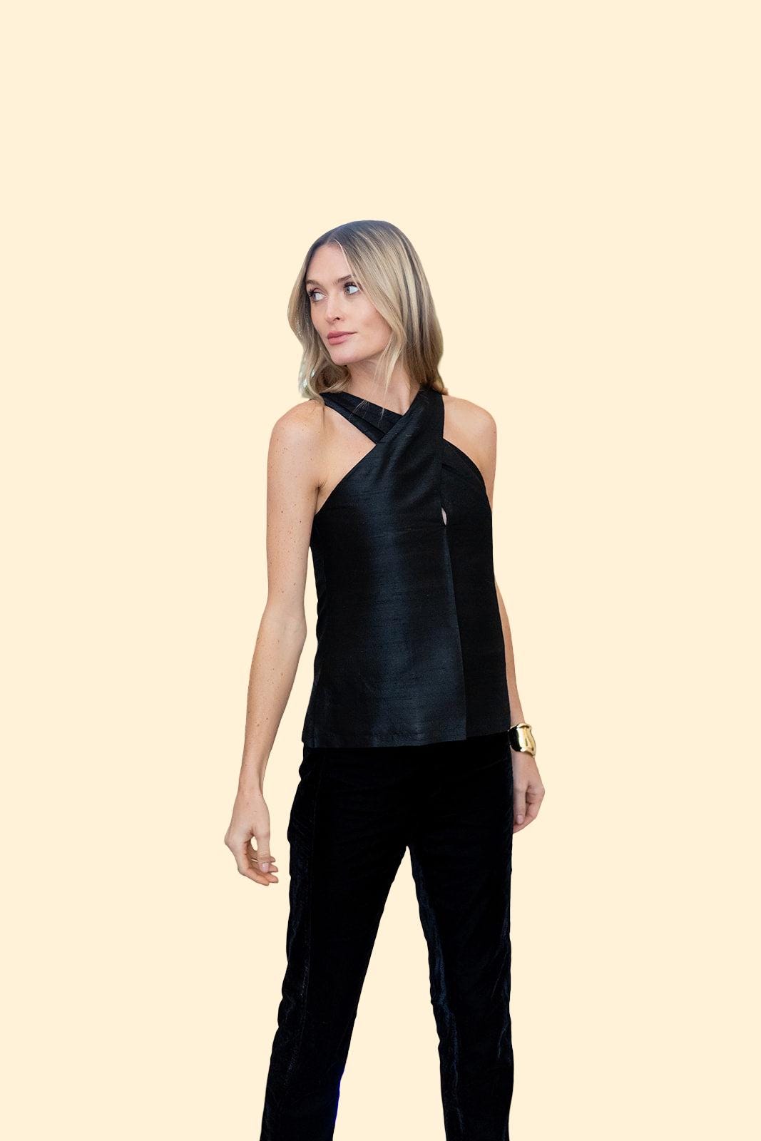 Black Silk Dupioni Cross-Neck Sleeveless Criss Cross Party Wear Wom...