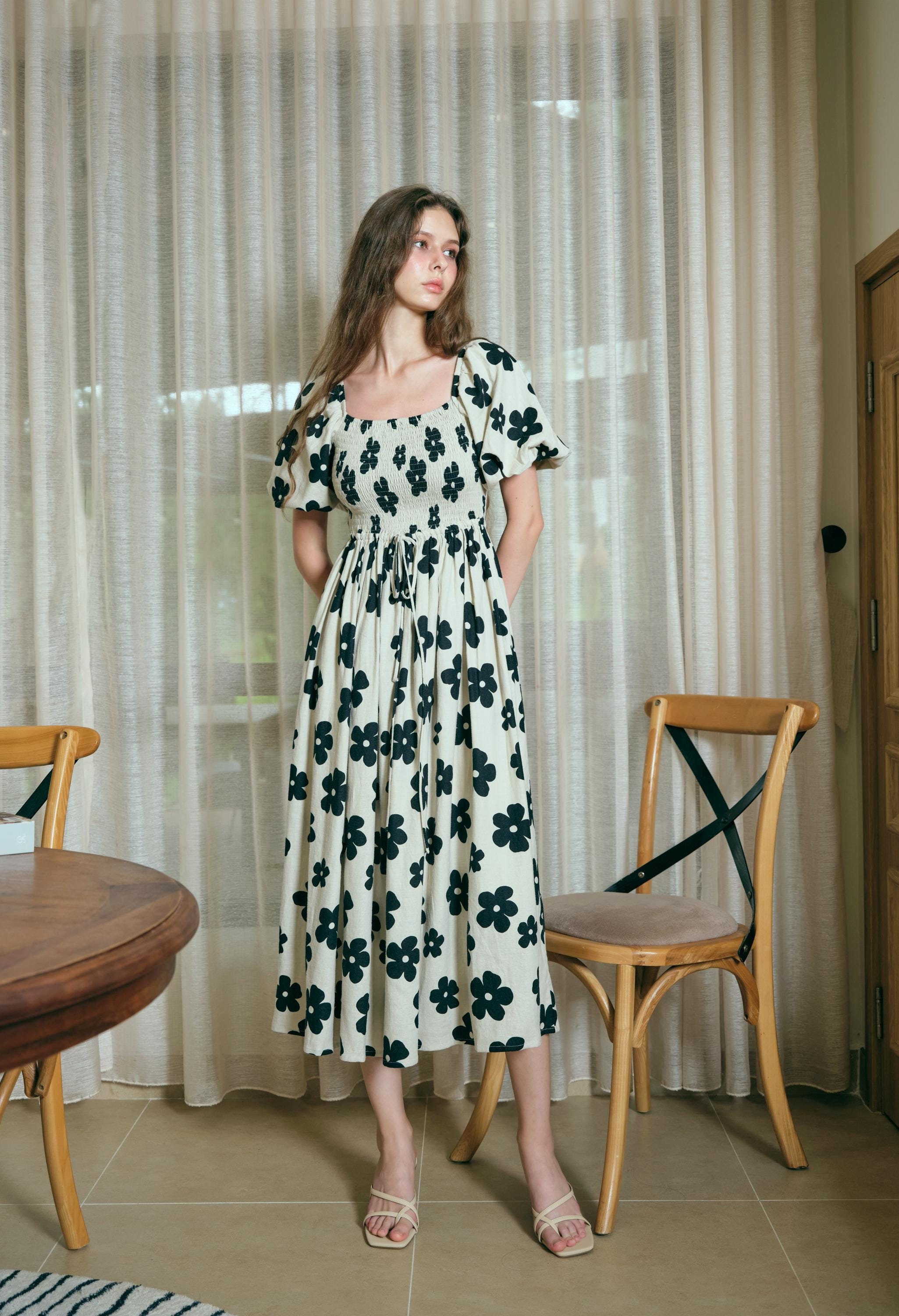 Martine Midi Linen Dress in Dark Floral - Long linen dress for wome...