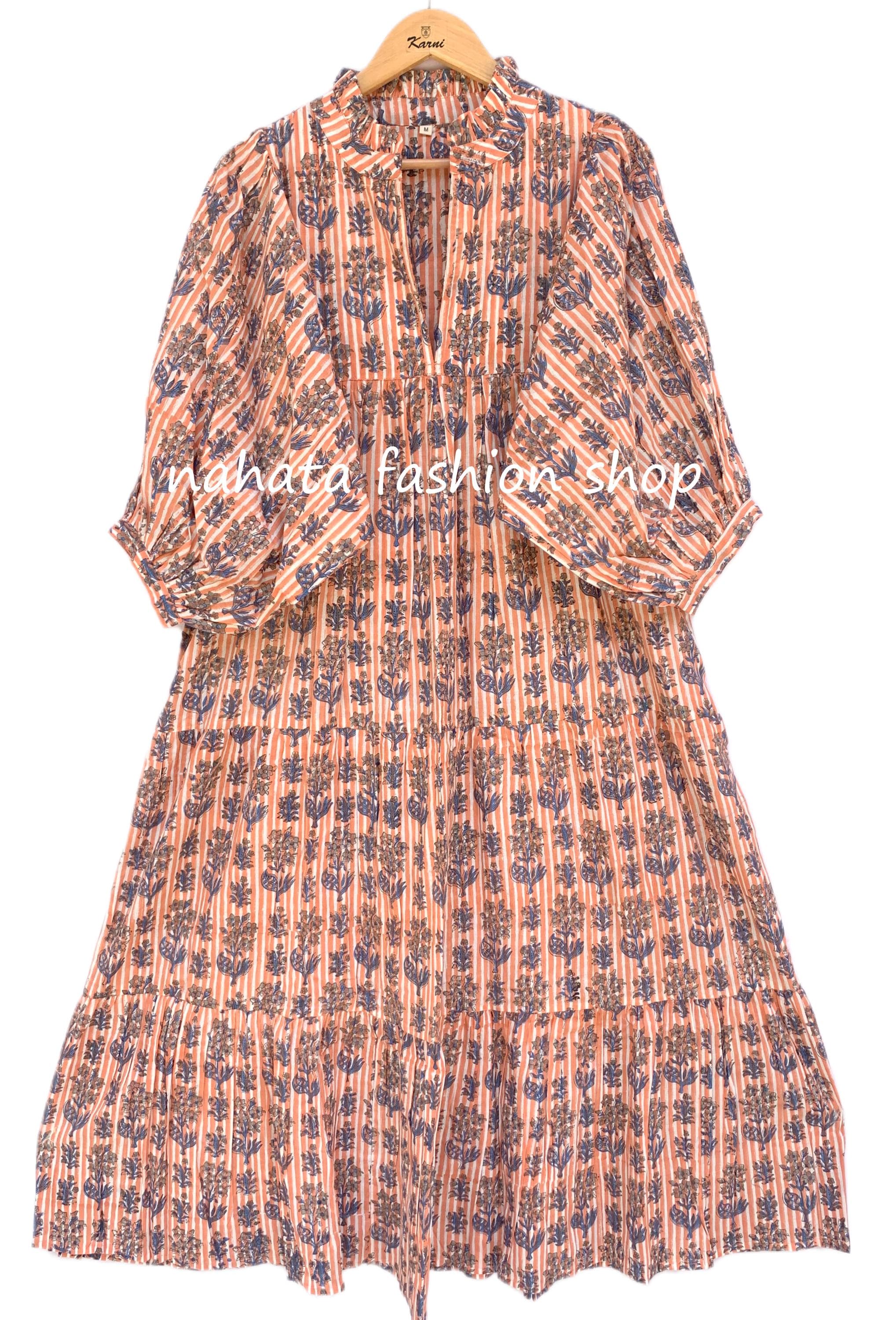 Peach & Blue Floral Striped Hand Block Printed Cotton Midi Dres...