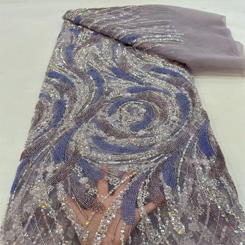 Hot Sale Exquisite Design Nigeria Handmade Embroidery Sequins Net Lace With Bead Top Quality For Par...