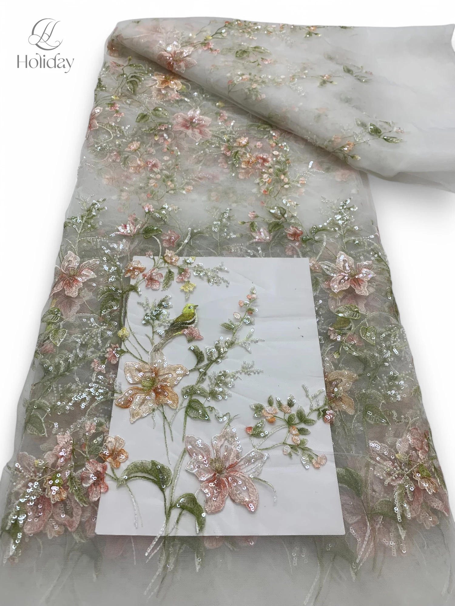 5Y/Hot selling French sequin fabric high-quality new design 2025 embroidery mesh lace 3D flower bead...