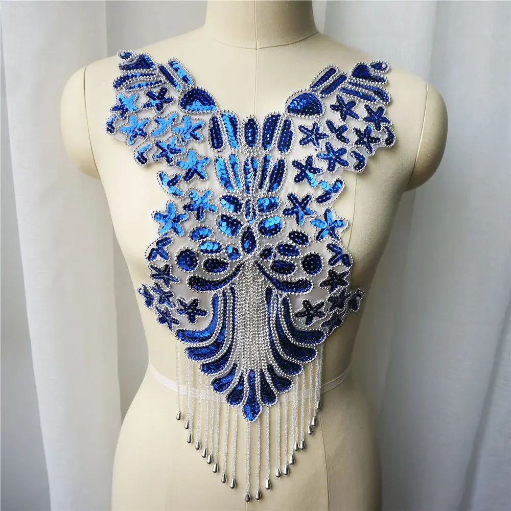 Royal Blue Sequin Lace Fabric Beads Tassel Wedding Gown Appliques Collar Baroque Embroidery Sew Patc...