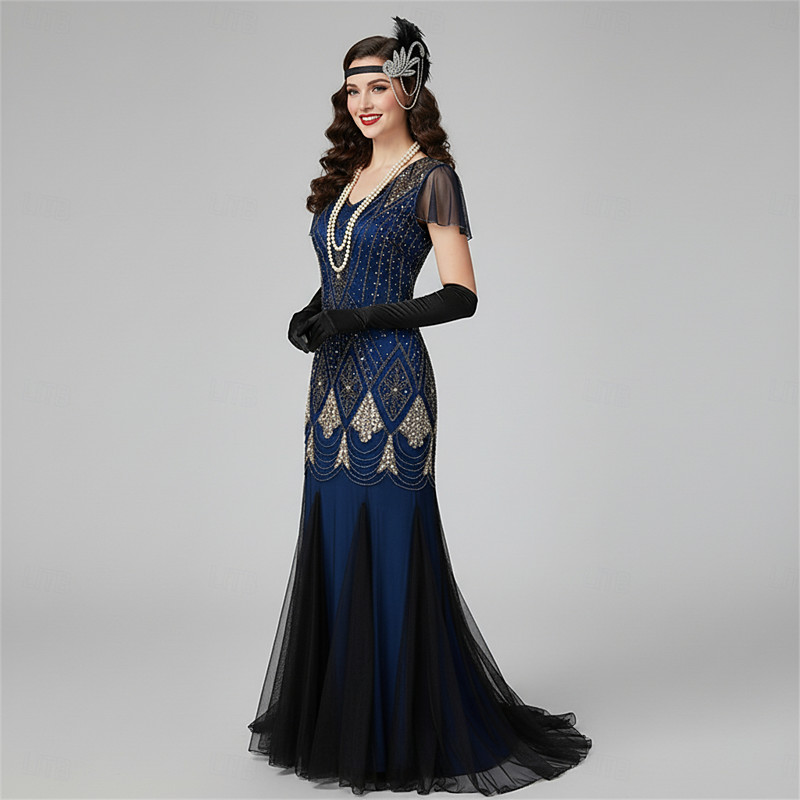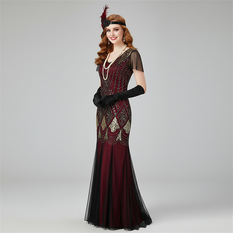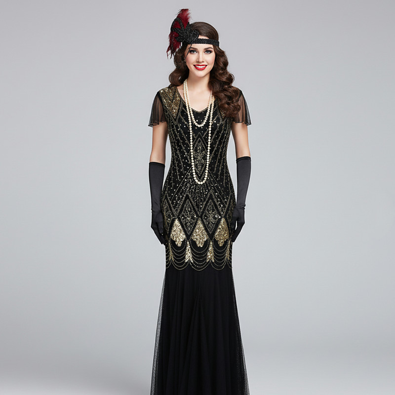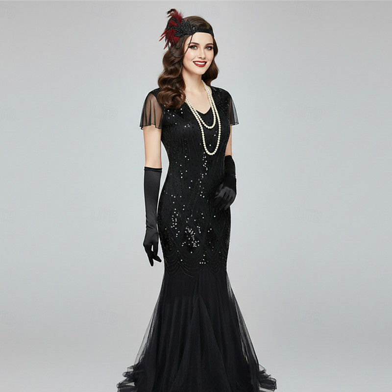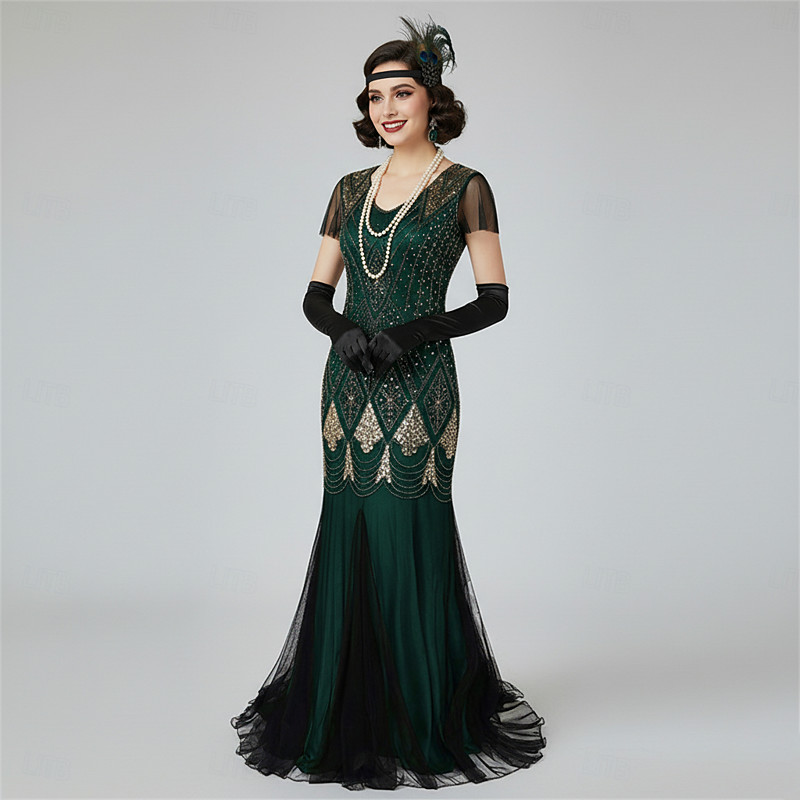 Set Retro Vintage Roaring 20s 1920s Floor Length Dress Outfits Cock...