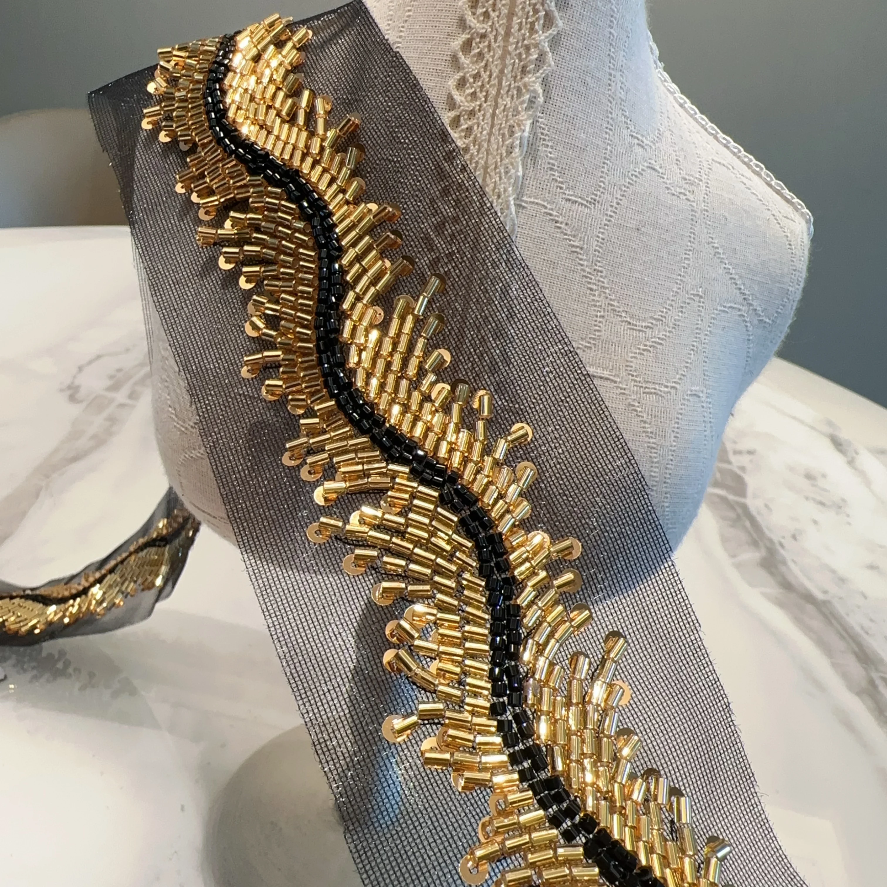 50CM Beaded Lace Trim Gold Black Shiny Embroidered Seed Beads Appli...