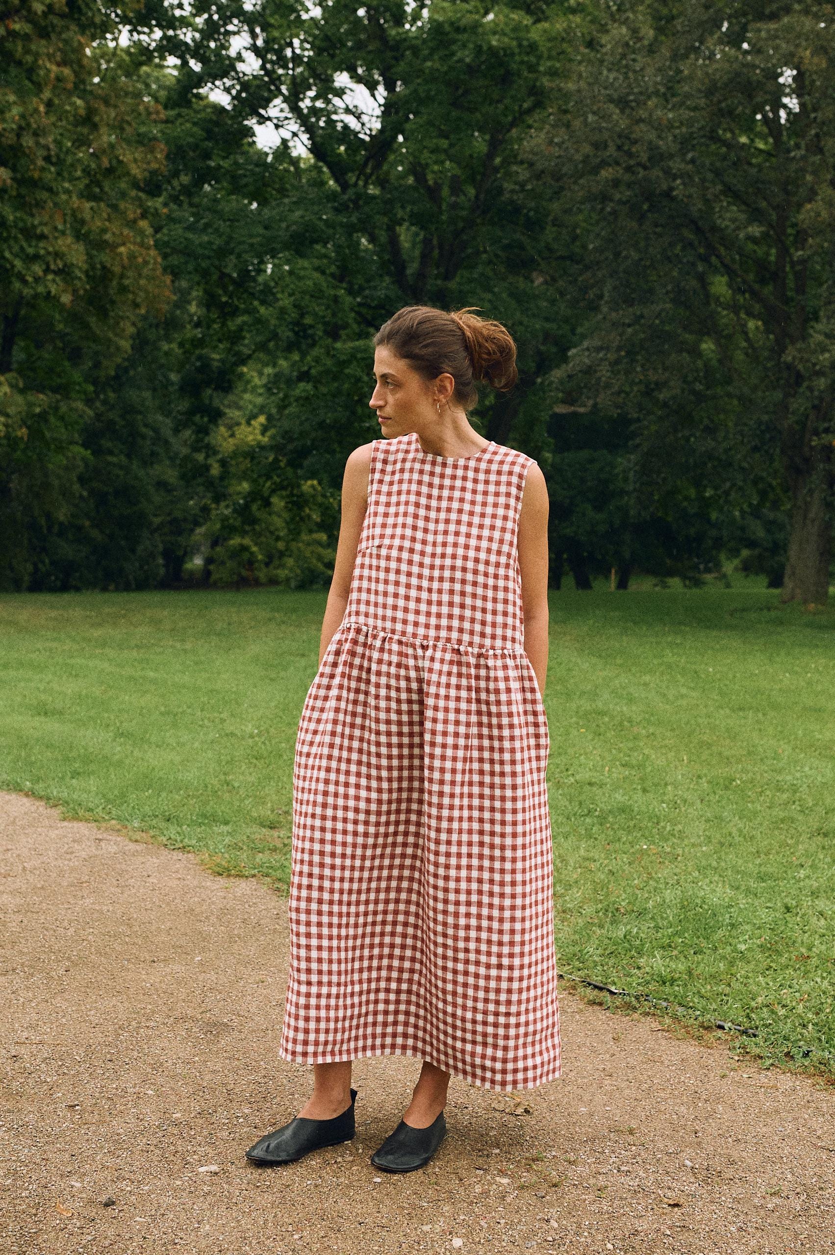 Ieva terracotta gingham smock dress - Sleeveless dress - Linen dres...