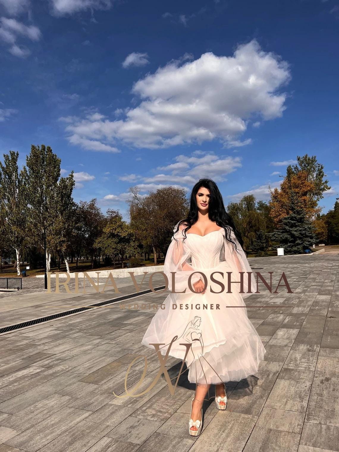"Short wedding dress with detachable sleeves, open shoulders and corset, embellished with sequi...