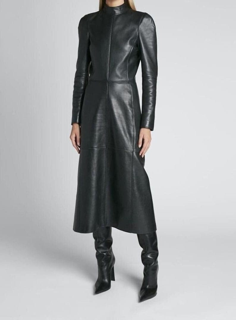Handmade women's leather dress, black leather dress, high neck leat...